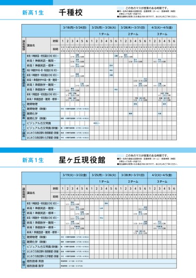 新高1生千種校この色のマスが授業のある時限です。●同一名称の講座は設置校舎・設置期間(ターム)・授業時間(時限)が異なっても同一内容です。●担当講師は変更になる場合がありますので、あらかじめご了承ください。3/18(月)~3/24(日)3/25(月)・3/26(火)3/28(木)〜3/31(日)4/2(火)〜4/5(金)0ターム1ターム2ターム3ターム1234561234561234561234569:10〜10:4011:00〜12:3013:40〜15:1015:30〜17:0017:20〜18:5019:10〜20:409:10〜10:4011:00〜12:3013:40〜15:1015:30〜17:0017:20〜18:5019:10〜20:409:10〜10:4011:00〜12:3013:40〜15:1015:30〜17:0017:20〜18:5019:10〜20:409:10〜10:4011:00〜12:3013:40〜15:1015:30〜17:0017:20〜18:5019:10〜20:40時限時間講座名講座種類教科新高1準備英語-特別選抜(ONEWEX)-新高1準備英語-難関-新高1準備英語-標準-新高1準備数学中高一貫-特別選抜(ONEWEX)-新高1準備数学-特別選抜(ONEWEX)-新高1準備数学中高一貫-難関-新高1準備数学-難関-新高1準備数学-標準-新高1準備国語-特別選抜(ONEWEX)-新高1準備国語-難関・標準-難関物理難関物理(映像)難関化学難関化学(映像)ビジュアル古文常識ビジュアル古文常識(映像)園はじめての高校理科(物理基礎)映像)西浦はじめての高校理科(化学基礎)映像)中村木村青野玉置登木3/28・29の2日間百々3/28・29の2日間市位4/2・3の2日間笠井宮田水嶋河合竹内3/30・31の2日間河原3/28・29の2日間三輪4/4・5の2日間平野・鈴木(孝)3/30・31の2日間宮地安達・伊藤4/2・3の2日間佐藤・鈴木(孝)4/2・3の2日間坂本青野大髙玉置3/19・20の2日間深津3/18・19の2日間百々3/23・24の2日間西畑3/21・22の2日間小倉3/18・19の2日間嶋田3/23・24の2日間安達・伊藤3/19・20の2日間佐藤・横井3/21・22の2日間※視聴可能期間:3/7(木)〜4/30(火)※視聴可能期間:3/7(木)〜4/30(火)※視聴可能期間:3/7(木)〜4/30(火)※視聴可能期間:3/7(木)〜4/30(火)※視聴可能期間:3/7(木)〜4/30(火)鈴木(一)レベルアップ講座新学年準備講座レベル別講座テーマ講座新高1生星ヶ丘現役館この色のマスが授業のある時限です。●同一名称の講座は設置校舎・設置期間(ターム)・授業時間(時限)が異なっても同一内容です。●担当講師は変更になる場合がありますので、あらかじめご了承ください。3/19(火)〜3/22(金)3/25(月)・3/26(火)3/28(木)~3/31(日)4/2(火)~4/5(金)0ターム1ターム2ターム3ターム講座名時限時間1234561234561234561234569:10〜10:4011:00〜12:3013:40〜15:1015:30〜17:0017:20〜18:5019:10〜20:409:10〜10:4011:00〜12:3013:40〜15:1015:30〜17:0017:20〜18:5019:10〜20:409:10〜10:4011:00〜12:3013:40〜15:1015:30〜17:0017:20〜18:5019:10〜20:409:10〜10:4011:00〜12:3013:40〜15:1015:30〜17:0017:20〜18:5019:10〜20:40●2024年度/春期講習/中部/千種/高1生/パターン14452024_58_4_413_31_20231130110615.csv/1ページ校了時削除笹村山本杉山松岡3/30・31の2日間青木3/30・31の2日間水嶋3/28・29の2日間日嵩・鈴木(孝)3/28・29の2日間杉山4/2・3の2日間村瀬(竜)4/4・5の2日間笹村3/21・22の2日間笹村3/21・22の2日間村瀬3/19・20の2日間杉山3/21・22の2日間水嶋3/21・22の2日間村瀬(竜)3/19・20の2日間※視聴可能期間:3/7(木)〜4/30(火)※視聴可能期間:3/7(木)〜4/30(火)※視聴可能期間:3/7(木)〜4/30(火)※視聴可能期間:3/7(木)〜4/30(火)※視聴可能期間:3/7(木)〜4/30(火)実施期間:3/1(金)〜3/27(水)実施期間:3/1(金)〜3/27(水)新高1準備英語-特別選抜(ONEWEX)-新高1準備英語-難関-新高1準備英語-標準-新高1準備数学-特別選抜(ONEWEX)-新高1準備数学-難関-新高1準備数学-標準-新高1準備国語-難関・標準-難関物理(映像)難関化学(映像)ビジュアル古文常識(映像)園はじめての高校理科(物理基礎)映像)西浦はじめての高校理科(化学基礎)映像)中村個別指導英語個別指導数学木村青野講座種類教科レベルアップ講座新学年準備講座レベル別テーマ講座個別
