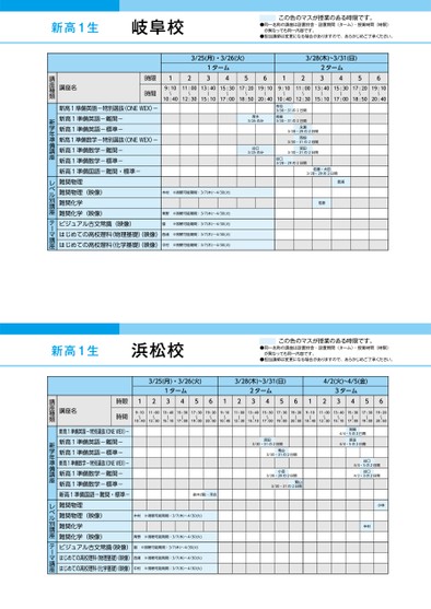新高1生岐阜校この色のマスが授業のある時限です。●同一名称の講座は設置校舎・設置期間(ターム)・授業時間(時限)が異なっても同一内容です。●担当講師は変更になる場合がありますので、あらかじめご了承ください。講座名時限時間3/25(月)・3/26(火)121ターム3456123/28(木)~3/31(日)2ターム34569:10〜11:0013:4015:3017:2019:10〜〜〜〜〜10:4012:3015:1017:0018:5020:409:10〜11:0013:4015:3017:2019:10〜〜〜〜〜15:1017:0018:5020:4012:3010:40市位3/30・31の2日間岩崎3/30・31の2日間永瀬3/28・29の2日間西畑3/30・31の2日間宮田3/30・31の2日間谷口3/28・29の2日間佐藤・大田3/28・29の2日間西浦若原新高1準備英語-特別選抜(ONEWEX)-新高1準備英語-難関-新高1準備英語-標準-新高1準備数学-特別選抜(ONEWEX)-新高1準備数学-難関-新高1準備数学-標準-新高1準備国語-難関・標準-難関物理難関物理(映像)難関化学難関化学(映像)ビジュアル古文常識(映像)はじめての高校理科(物理基礎)映像)西浦はじめての高校理科(化学基礎)映像)中村木村青野園青木3/26のみ谷口3/25のみ※視聴可能期間:3/7(木)〜4/30(火)※視聴可能期間:3/7(木)〜4/30(火)※視聴可能期間:3/7(木)〜4/30(火)※視聴可能期間:3/7(木)〜4/30(火)※視聴可能期間:3/7(木)〜4/30(火)講座種類教科レベルアップ講座新学年準備講座レベル別講座テーマ講座新高1生浜松校この色のマスが授業のある時限です。●同一名称の講座は設置校舎・設置期間(ターム)・授業時間(時限)が異なっても同一内容です。●担当講師は変更になる場合がありますので、あらかじめご了承ください。講座名時限時間3/25(月)・3/26(火)3/28(木)~3/31(日)4/2(火)~4/5(金)1ターム341256122ターム3456123ターム34569:10〜10:4011:00〜12:3013:40〜15:1015:30〜17:0017:30〜19:0019:20〜20:509:10〜10:4011:00〜12:3013:40〜15:1015:30〜17:0017:30〜19:0019:20〜20:509:10〜10:4011:00〜12:3013:40〜15:1015:30〜17:0017:30〜19:0019:20〜20:50新高1準備英語-特別選抜(ONEWEX)-新高1準備英語-難関-新高1準備英語-標準-新高1準備数学-特別選抜(ONEWEX)-新高1準備数学-難関-新高1準備数学-標準-新高1準備国語-難関・標準-難関物理難関物理(映像)難関化学難関化学(映像)ビジュアル古文常識(映像)園はじめての高校理科(物理基礎)映像)西浦はじめての高校理科(化学基礎)映像)中村青野木村原田3/30・31の2日間亀山3/30・31の2日間小田3/28・29の2日間鷲山3/30・31の2日間岩崎4/4・5の2日間原田4/4・5の2日間谷口4/4・5の2日間谷口4/2・3の2日間小林中村鈴木(理)・河合※視聴可能期間:3/7(木)〜4/30(火)※視聴可能期間:3/7(木)〜4/30(火)※視聴可能期間:3/7(木)〜4/30(火)※視聴可能期間:3/7(木)〜4/30(火)※視聴可能期間:3/7(木)〜4/30(火)講座種類教科レベルアップ講座新学年準備講座レベル別講座テーマ講座●2024年度/春期講習/中部/岐阜/高1生/パターン12452024_58_4_412_31_20231130103037.csv/1ページ校了時削除