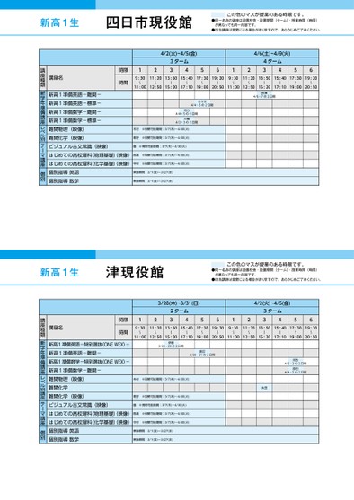 新高1生四日市現役館この色のマスが授業のある時限です。●同一名称の講座は設置校舎・設置期間(ターム)・授業時間(時限)が異なっても同一内容です。●担当講師は変更になる場合がありますので、あらかじめご了承ください。4/2(火)~4/5(金)3ターム341256124/6(土)~4/9(火)4ターム34569:30〜11:2013:5015:4017:3019:20〜〜〜〜〜9:30〜11:2013:5015:4017:3019:20〜〜〜〜〜11:0012:5015:2017:1019:0020:5011:0012:5015:2017:1019:0020:50時限時間講座名講座種類教科長瀬4/6・7の2日間佐々木4/4・5の2日間河合4/4・5の2日間三輪4/2・3の2日間※視聴可能期間:3/7(木)〜4/30(火)※視聴可能期間:3/7(木)〜4/30(火)※視聴可能期間:3/7(木)〜4/30(火)※視聴可能期間:3/7(木)〜4/30(火)※視聴可能期間:3/7(木)〜4/30(火)実施期間:3/1(金)〜3/27(水)実施期間:3/1(金)〜3/27(水)新高1準備英語-難関-新高1準備英語-標準-新高1準備数学-難関-新高1準備数学-標準-難関物理(映像)難関化学(映像)ビジュアル古文常識(映像)はじめての高校理科(物理基礎)映像)西浦はじめての高校理科(化学基礎)映像)中村個別指導英語個別指導数学木村青野園レベルアップ講座新学年準備講座レベル別テーマ講座個別新高1生津現役館この色のマスが授業のある時限です。●同一名称の講座は設置校舎・設置期間(ターム)・授業時間(時限)が異なっても同一内容です。●担当講師は変更になる場合がありますので、あらかじめご了承ください。3/28(木)~3/31(日)122ターム3456124/2(火)~4/5(金)3ターム34569:30〜11:2013:5015:4017:3019:20〜〜〜〜〜9:30〜11:2013:5015:4017:3019:20〜〜〜〜〜11:0012:5015:2017:1019:0020:5011:0012:5015:2017:1019:0020:50時限時間講座名講座種類教科伊藤3/28・29の2日間渡辺3/30・31の2日間※視聴可能期間:3/7(木)〜4/30(火)※視聴可能期間:3/7(木)〜4/30(火)※視聴可能期間:3/7(木)〜4/30(火)※視聴可能期間:3/7(木)〜4/30(火)※視聴可能期間:3/7(木)〜4/30(火)河合4/2・3の2日間原田4/4・5の2日間太田実施期間:3/1(金)〜3/27(水)実施期間:3/1(金)〜3/27(水)新高1準備英語-特別選抜(ONEWEX)-新高1準備英語-難関-新高1準備数学-特別選抜(ONEWEX)-新高1準備数学-難関-難関物理(映像)難関化学難関化学(映像)ビジュアル古文常識(映像)はじめての高校理科(物理基礎)映像)西浦はじめての高校理科(化学基礎)映像)中村個別指導英語個別指導数学木村青野園レベルアップ講座新学年準備講座レベル別講座テーマ講座個別●2024年度/春期講習/中部/四日市/高1生/パターン12452024_58_4_435_31_20231130103037.csv/1ページ校了時削除