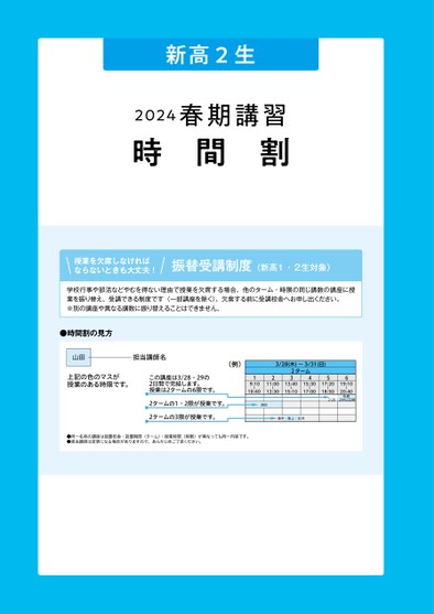 新高2生2024春期講習時間割授業を欠席しなければならないときも大丈夫!振替受講制度〈新高1・2生対象〉学校行事や部活などやむを得ない理由で授業を欠席する場合、他のターム・時限の同じ講数の講座に授業を振り替え、受講できる制度です(一部講座を除く)。欠席する前に受講校舎へお申し出ください。※別の講座や異なる講数に振り替えることはできません。●時間割の見方山田担当講師名(例)3/28(木)〜3/31(日)2ターム3413:4015:1015:3017:00上記の色のマスが授業のある時限です。この講座は3/28・29の2日間で完結します。授業は2タームの6限です。19:1010:40211:0012:302タームの1・2限が授業です。池田517:2018:50619:1020:40松原3/28・29の2日間2タームの3限が授業です。畑中・阪上・杉井●同一名称の講座は設置校舎・設置期間(ターム)・授業時間(時限)が異なっても同一内容です。●担当講師は変更になる場合がありますので、あらかじめご了承ください。