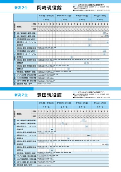 新高2生岡崎現役館この色のマスが授業のある時限です。●同一名称の講座は設置校舎・設置期間(ターム)・授業時間(時限)が異なっても同一内容です。●担当講師は変更になる場合がありますので、あらかじめご了承ください。3/25(月)・3/26(火)3/28(木)~3/31(日)4/2(火)~4/5(金)4/6(土)~4/9(火)1ターム2ターム3ターム4ターム12345612345612345612345610:00〜11:3011:50〜13:2014:30〜16:0016:20〜17:5018:10〜19:4020:00〜21:3010:00〜11:3011:50〜13:2014:30〜16:0016:20〜17:5018:10〜19:4020:00〜21:3010:00〜11:3011:50〜13:2014:30〜16:0016:20〜17:5018:10〜19:4020:00〜21:3010:00〜11:3011:50〜13:2014:30〜16:0016:20〜17:5018:10〜19:4020:00〜21:30特別選抜:小山/難関:佐野/標準:岩崎※視聴可能期間:3/7(木)〜4/30(火)市位森村瀬4/6・7の2日間山田(勝)4/6・7の2日間村瀬山田(勝)原田特別選抜理系数学中高一貫:藤野/特別選抜:水嶋/難関理系数学中高一貫:宮田/難関数学中高一貫:依田/難関:依田/標準:山本(洋)※視聴可能期間:3/7(木)〜4/30(火)日嵩・伊藤吉嗣特別選抜:高橋・山村・江/難関:光田・坂下/標準:井上(真)・菅井※視聴可能期間:3/7(木)〜4/30(火)若原特別選抜物理:乾/特別選抜化学:浅利/難関物理:木村/難関化学:青野※視聴可能期間:3/7(木)〜4/30(火)ビジュアル古文常識:園/古典文法基礎:伊藤※視聴可能期間:3/7(木)〜4/30(火)物理基礎:西浦/化学基礎:中村※視聴可能期間:3/7(木)〜4/30(火)英語:近藤/数学:依田/現代文:高橋※視聴可能期間:3/7(木)〜4/30(火)実施期間:3/1(金)〜3/27(水)講座名時限時間新高2準備英語-難関・標準-新高2準備数学-難関・標準-特別選抜英語(ONEWEX)難関英語(トップ・ハイレベル)標準英語特別選抜/難関/標準英語(映像)特別選抜数学(ONEWEX)難関数学(トップ・ハイレベル)標準数学特別選抜/難関/標準数学(映像)難関国語特別選抜/難関/標準国語(映像)難関化学特別選抜/難関理科(映像)ビジュアル古文常識/古典文法基礎(映像)はじめての高校物理基礎/化学基礎(映像)共通テスト対策英語/数学/現代文(映像)個別指導英語/数学講座種類教科新学年準備レベルアップ講座レベル別講座テーマ講座共テ共通テスト対策講座個別新高2生豊田現役館この色のマスが授業のある時限です。●同一名称の講座は設置校舎・設置期間(ターム)・授業時間(時限)が異なっても同一内容です。●担当講師は変更になる場合がありますので、あらかじめご了承ください。3/25(月)・3/26(火)3/28(木)~3/31(日)4/2(火)~4/5(金)4/6(土)~4/9(火)1ターム2ターム3ターム4ターム講座名時限時間12345612345612345612345610:00〜11:3011:50〜13:2014:30〜16:0016:20〜17:5018:10〜19:4020:00〜21:3010:00〜11:3011:50〜13:2014:30〜16:0016:20〜17:5018:10〜19:4020:00〜21:3010:00〜11:3011:50〜13:2014:30〜16:0016:20〜17:5018:10〜19:4020:00〜21:3010:00〜11:3011:50〜13:2014:30〜16:0016:20〜17:5018:10〜19:4020:00〜21:30講座種類教科新学年準備レベルアップ講座レベル別講座テーマ講座共テ共通テスト対策講座個別新高2準備英語-難関・標準-新高2準備数学-難関・標準-難関英語(トップ・ハイレベル)標準英語特別選抜/難関/標準英語(映像)難関数学(トップ・ハイレベル)標準数学特別選抜/難関/標準数学(映像)標準国語特別選抜/難関/標準国語(映像)難関化学特別選抜/難関理科(映像)ビジュアル古文常識/古典文法基礎(映像)はじめての高校物理基礎/化学基礎(映像)共通テスト対策英語/数学/現代文(映像)個別指導英語/数学河合3/30・31の2日間山本4/4・5の2日間山本桑野特別選抜:小山/難関:佐野/標準:岩崎※視聴可能期間:3/7(木)〜4/30(火)山上村瀬(竜)特別選抜理系数学中高一貫:藤野/特別選抜:水嶋/難関理系数学中高一貫:宮田/難関数学中高一貫:依田/難関:依田/標準:山本(洋)※視聴可能期間:3/7(木)〜4/30(火)平野・鈴木(孝)特別選抜:高橋・山村・江/難関:光田・坂下/標準:井上(真)・菅井※視聴可能期間:3/7(木)〜4/30(火)若原特別選抜物理:乾/特別選抜化学:浅利/難関物理:木村/難関化学:青野※視聴可能期間:3/7(木)〜4/30(火)ビジュアル古文常識:園/古典文法基礎:伊藤※視聴可能期間:3/7(木)〜4/30(火)物理基礎:西浦/化学基礎:中村※視聴可能期間:3/7(木)〜4/30(火)英語:近藤/数学:依田/現代文:高橋※視聴可能期間:3/7(木)〜4/30(火)●2024年度/春期講習/中部/岡崎/高2生/パターン1445実施期間:3/1(金)〜3/27(水)2024_58_4_450_32_20231130110141.csv/1ページ校了時削除
