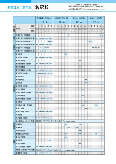 森本(将)長谷川宮下山下(博)新高3生・高卒生名駅校この色のマスが授業のある時限です。●同一名称の講座は設置校舎・設置期間(ターム)・授業時間(時限)が異なっても同一内容です。●担当講師は変更になる場合がありますので、あらかじめご了承ください。3/25(月)・3/26(火)3/28(木)~3/31(日)4/2(火)~4/5(金)4/6(土)・4/7(日)1ターム2ターム3ターム4ターム1234561234561234561234569:10〜10:4011:00〜12:3013:40〜15:1015:30〜17:0017:20〜18:5019:10〜20:409:10〜10:4011:00〜12:3013:40〜15:1015:30〜17:0017:20〜18:5019:10〜20:409:10〜10:4011:00〜12:3013:40〜15:1015:30〜17:0017:20〜18:5019:10〜20:409:10〜10:4011:00〜12:3013:40〜15:1015:30〜17:0017:20〜18:5019:10〜20:40時限時間講座名講座種類教科菱山・佐河※視聴可能期間:3/7(木)〜4/30(火)木村・隼坂:4/8(月)・4/9(火)17:00〜18:30/19:00〜20:30ご自宅でタブレットやスマートフォン、パソコンなどで受講する「ライブ配信型」の授業です。佐々木河村室田宮下松延山下(博)登木守屋金井百々小林※視聴可能期間:3/7(木)〜4/30(火)成川:4/6(土)・4/7(日)17:00〜18:30/19:00〜20:30ご自宅でタブレットやスマートフォン、パソコンなどで受講する「ライブ配信型」の授業です。堂前※視聴可能期間:3/7(木)〜4/30(火)●2024年度/春期講習/中部/名駅校/高3・卒生/パターン14402024_58_4_414_11_20231130093216.csv/1ページ校了時削除河村長谷川伊倉塚越登木守屋河村長谷川河原石川・山村佐藤・河合・野村松延岩崎小倉川野玉置笹村※視聴可能期間:3/7(木)〜4/30(火)玉置※視聴可能期間:3/7(木)〜4/30(火)平野※視聴可能期間:3/7(木)〜4/30(火)※視聴可能期間:3/7(木)〜4/30(火)福永・井上(摩)・野村※視聴可能期間:3/7(木)〜4/30(火)※視聴可能期間:3/7(木)〜4/30(火)※視聴可能期間:3/7(木)〜4/30(火)佐野※視聴可能期間:3/7(木)〜4/30(火)※視聴可能期間:3/7(木)〜4/30(火)※視聴可能期間:3/7(木)〜4/30(火)村上※視聴可能期間:3/7(木)〜4/30(火)香坂刈谷高沢三河・園・髙橋共通テスト対策英語共通テスト対策英語(映像)宮下共通テスト対策数学共通テスト対策数学(映像)水嶋共通テスト対策国語共通テスト対策国語(映像)高橋・伊藤・江東大英語東大英語(映像)東大文類数学東大文類数学(映像)東大理類数学東大理類数学(映像)東大国語(映像)東大日本史東大世界史京大英語京大英語(映像)京大文系数学京大文系数学(映像)京大理系数学京大理系数学(映像)名大英語名大数学(文・理共通)早慶大英語早慶大英語(映像)早大国語早大国語(映像)早大国語(オンライン授業)医進英語医進数学特別選抜英語難関国公立大英語国公立大英語私大英語英文法・語法英文法・語法(映像)英文法・語法(オンライン授業)基礎英語(映像)山本(敏)西浦共通テスト対策講座大学別対策医進講座英語