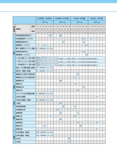 西畑加藤谷口森本(将)※視聴可能期間:3/7(木)〜4/30(火)水嶋野村小倉長谷川三田村小栗森本(啓):4/7(日)9:30〜11:00/11:20〜12:50ご自宅でタブレットやスマートフォン、パソコンなどで受講する「ライブ配信型」の授業です。※2024年度河合塾大学受験科生専用の講座です。佐野:4/6(土)13:40〜15:10/15:30〜17:00ご自宅でタブレットやスマートフォン、パソコンなどで受講する「ライブ配信型」の授業です。※2024年度河合塾大学受験科生専用の講座です。森本(啓):4/6(土)9:30〜11:00/11:20〜12:50ご自宅でタブレットやスマートフォン、パソコンなどで受講する「ライブ配信型」の授業です。※2024年度河合塾大学受験科生専用の講座です。3/25(月)・3/26(火)3/28(木)~3/31(日)4/2(火)~4/5(金)4/6(土)・4/7(日)1ターム2ターム3ターム4ターム1234561234561234561234569:10〜10:4011:00〜12:3013:40〜15:1015:30〜17:0017:20〜18:5019:10〜20:409:10〜10:4011:00〜12:3013:40〜15:1015:30〜17:0017:20〜18:5019:10〜20:409:10〜10:4011:00〜12:3013:40〜15:1015:30〜17:0017:20〜18:5019:10〜20:409:10〜10:4011:00〜12:3013:40〜15:1015:30〜17:0017:20〜18:5019:10〜20:40時限時間講座名講座種類教科高梨特別選抜理系数学ⅢC特別選抜数学ⅠAⅡBC難関理系数学ⅢC難関数学ⅠAⅡBC標準・難関数学(ベクトル)映像)成合標準理系数学ⅢC標準数学ⅠAⅡBCテーマ数学(三角関数)オンライン授業)大受専用)テーマ数学(ベクトル)オンライン授業)大受専用)テーマ数学(複素数平面)オンライン授業)大受専用)数学ⅠAⅡ演習[基礎]映像)大庭数学Ⅲ[基礎]映像)難関国公立大現代文(論述対策)難関国公立大古文(論述対策)難関現代文難関古文標準現代文標準古文ビジュアル古文常識(映像)園古典文法基礎古典文法基礎(映像)小論文特別選抜物理特別選抜化学難関物理難関化学難関生物標準物理標準化学標準生物日本史論述(映像)世界史論述(映像)日本史世界史伊藤数学国語小論文理科地歴※視聴可能期間:3/7(木)〜4/30(火)※視聴可能期間:3/7(木)〜4/30(火)※視聴可能期間:3/7(木)〜4/30(火)※視聴可能期間:3/7(木)〜4/30(火)瀬木花田太田※視聴可能期間:3/7(木)〜4/30(火)※視聴可能期間:3/7(木)〜4/30(火)坂本(勝)坂本(新)高橋高尾坂本榊原武下山村井上(摩)武下笹森坂本岸岸青野村松髙田渡辺平松山村大宮西浦桝元●2024年度/春期講習/中部/名駅校/高3・卒生/パターン14402024_58_4_414_11_20231130093216.csv/2ページ校了時削除