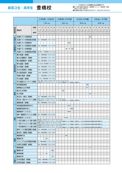 新高3生・高卒生豊橋校この色のマスが授業のある時限です。●同一名称の講座は設置校舎・設置期間(ターム)・授業時間(時限)が異なっても同一内容です。●担当講師は変更になる場合がありますので、あらかじめご了承ください。3/25(月)・3/26(火)3/28(木)~3/31(日)4/2(火)~4/5(金)4/6(土)・4/7(日)1ターム2ターム3ターム4ターム1234561234561234561234569:10〜10:4011:00〜12:3013:40〜15:1015:30〜17:0017:20〜18:5019:10〜20:409:10〜10:4011:00〜12:3013:40〜15:1015:30〜17:0017:20〜18:5019:10〜20:409:10〜10:4011:00〜12:3013:40〜15:1015:30〜17:0017:20〜18:5019:10〜20:409:10〜10:4011:00〜12:3013:40〜15:1015:30〜17:0017:20〜18:5019:10〜20:40時限時間講座名講座種類教科宮下川野宮下笠井森本(将)安藤・河合・野村市位宮田村瀬(宗)村瀬(宗)森本(将)木村・隼坂:4/8(月)・4/9(火)17:00〜18:30/19:00〜20:30ご自宅でタブレットやスマートフォン、パソコンなどで受講する「ライブ配信型」の授業です。小林※視聴可能期間:3/7(木)〜4/30(火)成川:4/6(土)・4/7(日)17:00〜18:30/19:00〜20:30ご自宅でタブレットやスマートフォン、パソコンなどで受講する「ライブ配信型」の授業です。※視聴可能期間:3/7(木)〜4/30(火)※視聴可能期間:3/7(木)〜4/30(火)森本(啓):4/7(日)9:30〜11:00/11:20〜12:50ご自宅でタブレットやスマートフォン、パソコンなどで受講する「ライブ配信型」の授業です。※2024年度河合塾大学受験科生専用の講座です。佐野:4/6(土)13:40〜15:10/15:30〜17:00ご自宅でタブレットやスマートフォン、パソコンなどで受講する「ライブ配信型」の授業です。※2024年度河合塾大学受験科生専用の講座です。森本(啓):4/6(土)9:30〜11:00/11:20〜12:50ご自宅でタブレットやスマートフォン、パソコンなどで受講する「ライブ配信型」の授業です。※2024年度河合塾大学受験科生専用の講座です。※視聴可能期間:3/7(木)〜4/30(火)高梨※視聴可能期間:3/7(木)〜4/30(火)※視聴可能期間:3/7(木)〜4/30(火)伊藤※視聴可能期間:3/7(木)〜4/30(火)河合安達荒木齋藤中村岸坂本(勝)※視聴可能期間:3/7(木)〜4/30(火)※視聴可能期間:3/7(木)〜4/30(火)※視聴可能期間:3/7(木)〜4/30(火)※視聴可能期間:3/7(木)〜4/30(火)※視聴可能期間:3/7(木)〜4/30(火)※視聴可能期間:3/7(木)〜4/30(火)※視聴可能期間:3/7(木)〜4/30(火)香坂※視聴可能期間:3/7(木)〜4/30(火)※視聴可能期間:3/7(木)〜4/30(火)※視聴可能期間:3/7(木)〜4/30(火)西浦※視聴可能期間:3/7(木)〜4/30(火)※視聴可能期間:3/7(木)〜4/30(火)※視聴可能期間:3/7(木)〜4/30(火)菱山・佐河※視聴可能期間:3/7(木)〜4/30(火)村上佐野刈谷高沢山本(敏)三河・園・髙橋共通テスト対策英語共通テスト対策英語(映像)宮下共通テスト対策数学共通テスト対策数学(映像)水嶋共通テスト対策国語共通テスト対策国語(映像)高橋・伊藤・江東大英語(映像)東大文類数学(映像)東大理類数学(映像)東大国語(映像)京大英語(映像)京大文系数学(映像)京大理系数学(映像)早慶大英語(映像)早大国語(映像)早大国語(オンライン授業)特別選抜英語難関国公立大英語国公立大英語私大英語英文法・語法(映像)英文法・語法(オンライン授業)基礎英語(映像)特別選抜理系数学ⅢC難関理系数学ⅢC難関数学ⅠAⅡBC標準・難関数学(ベクトル)映像)成合標準数学ⅠAⅡBCテーマ数学(三角関数)オンライン授業)大受専用)テーマ数学(ベクトル)オンライン授業)大受専用)テーマ数学(複素数平面)オンライン授業)大受専用)数学ⅠAⅡ演習[基礎]映像)大庭数学Ⅲ[基礎]映像)難関現代文難関古文ビジュアル古文常識(映像)園古典文法基礎(映像)難関物理難関化学標準物理標準化学日本史論述(映像)世界史論述(映像)坂本(新)堂前共通テスト対策講座大学別対策英語数学国語理科地歴●2024年度/春期講習/中部/豊橋/高3・卒生/パターン14452024_58_4_411_11_20231130111214.csv/1ページ校了時削除
