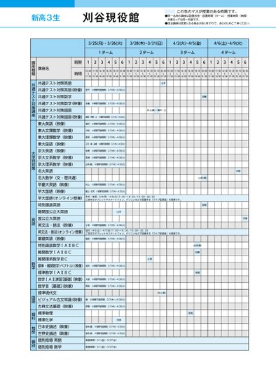 新高3生刈谷現役館この色のマスが授業のある時限です。●同一名称の講座は設置校舎・設置期間(ターム)・授業時間(時限)が異なっても同一内容です。●担当講師は変更になる場合がありますので、あらかじめご了承ください。3/25(月)・3/26(火)3/28(木)~3/31(日)4/2(火)~4/5(金)4/6(土)~4/9(火)1ターム2ターム3ターム4ターム講座名時限時間12345612345612345612345610:00〜11:3011:50〜13:2014:30〜16:0016:20〜17:5018:10〜19:4020:00〜21:3010:00〜11:3011:50〜13:2014:30〜16:0016:20〜17:5018:10〜19:4020:00〜21:3010:00〜11:3011:50〜13:2014:30〜16:0016:20〜17:5018:10〜19:4020:00〜21:3010:00〜11:3011:50〜13:2014:30〜16:0016:20〜17:5018:10〜19:4020:00〜21:30山本井上(真)・横井・江江澤井上(真)宇野宇野加藤山田(龍)岩崎山田(龍)加藤吉嗣宮地木村・隼坂:4/8(月)・4/9(火)17:00〜18:30/19:00〜20:30ご自宅でタブレットやスマートフォン、パソコンなどで受講する「ライブ配信型」の授業です。山本小林※視聴可能期間:3/7(木)〜4/30(火)成川:4/6(土)・4/7(日)17:00〜18:30/19:00〜20:30ご自宅でタブレットやスマートフォン、パソコンなどで受講する「ライブ配信型」の授業です。※視聴可能期間:3/7(木)〜4/30(火)※視聴可能期間:3/7(木)〜4/30(火)※視聴可能期間:3/7(木)〜4/30(火)※視聴可能期間:3/7(木)〜4/30(火)※視聴可能期間:3/7(木)〜4/30(火)※視聴可能期間:3/7(木)〜4/30(火)香坂※視聴可能期間:3/7(木)〜4/30(火)※視聴可能期間:3/7(木)〜4/30(火)※視聴可能期間:3/7(木)〜4/30(火)西浦※視聴可能期間:3/7(木)〜4/30(火)※視聴可能期間:3/7(木)〜4/30(火)※視聴可能期間:3/7(木)〜4/30(火)菱山・佐河※視聴可能期間:3/7(木)〜4/30(火)※視聴可能期間:3/7(木)〜4/30(火)※視聴可能期間:3/7(木)〜4/30(火)高梨※視聴可能期間:3/7(木)〜4/30(火)※視聴可能期間:3/7(木)〜4/30(火)伊藤※視聴可能期間:3/7(木)〜4/30(火)田島坂本(勝)※視聴可能期間:3/7(木)〜4/30(火)※視聴可能期間:3/7(木)〜4/30(火)実施期間:3/1(金)〜3/27(水)実施期間:3/1(金)〜3/27(水)村上佐野刈谷高沢山本(敏)三河・園・髙橋共通テスト対策英語共通テスト対策英語(映像)宮下共通テスト対策数学共通テスト対策数学(映像)水嶋共通テスト対策国語共通テスト対策国語(映像)高橋・伊藤・江東大英語(映像)東大文類数学(映像)東大理類数学(映像)東大国語(映像)京大英語(映像)京大文系数学(映像)京大理系数学(映像)名大英語名大数学(文・理共通)早慶大英語(映像)早大国語(映像)早大国語(オンライン授業)特別選抜英語難関国公立大英語国公立大英語英文法・語法(映像)英文法・語法(オンライン授業)基礎英語(映像)特別選抜数学ⅠAⅡBC難関数学ⅠAⅡBC難関理系数学ⅢC標準・難関数学(ベクトル)映像)成合標準数学ⅠAⅡBC数学ⅠAⅡ演習[基礎]映像)大庭数学Ⅲ[基礎]映像)標準現代文ビジュアル古文常識(映像)園古典文法基礎(映像)標準物理標準化学日本史論述(映像)世界史論述(映像)個別指導英語個別指導数学坂本(新)堂前講座種類教科共通テスト対策講座大学別対策英語数学国語理科地歴個別●2024年度/春期講習/中部/刈谷/高3・卒生/パターン14452024_58_4_448_11_20231130093216.csv/1ページ校了時削除