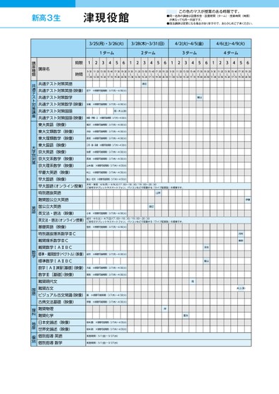 渡辺鷲山新高3生津現役館この色のマスが授業のある時限です。●同一名称の講座は設置校舎・設置期間(ターム)・授業時間(時限)が異なっても同一内容です。●担当講師は変更になる場合がありますので、あらかじめご了承ください。3/25(月)・3/26(火)3/28(木)~3/31(日)4/2(火)~4/5(金)4/6(土)~4/9(火)1ターム2ターム3ターム4ターム1234561234561234561234569:30〜11:0011:20〜12:5013:50〜15:2015:40〜17:1017:30〜19:0019:20〜20:509:30〜11:0011:20〜12:5013:50〜15:2015:40〜17:1017:30〜19:0019:20〜20:509:30〜11:0011:20〜12:5013:50〜15:2015:40〜17:1017:30〜19:0019:20〜20:509:30〜11:0011:20〜12:5013:50〜15:2015:40〜17:1017:30〜19:0019:20〜20:50時限時間講座名講座種類教科木村・隼坂:4/8(月)・4/9(火)17:00〜18:30/19:00〜20:30ご自宅でタブレットやスマートフォン、パソコンなどで受講する「ライブ配信型」の授業です。山岸渡辺小林※視聴可能期間:3/7(木)〜4/30(火)成川:4/6(土)・4/7(日)17:00〜18:30/19:00〜20:30ご自宅でタブレットやスマートフォン、パソコンなどで受講する「ライブ配信型」の授業です。※視聴可能期間:3/7(木)〜4/30(火)※視聴可能期間:3/7(木)〜4/30(火)※視聴可能期間:3/7(木)〜4/30(火)岡・井上(淳)※視聴可能期間:3/7(木)〜4/30(火)※視聴可能期間:3/7(木)〜4/30(火)※視聴可能期間:3/7(木)〜4/30(火)香坂※視聴可能期間:3/7(木)〜4/30(火)※視聴可能期間:3/7(木)〜4/30(火)※視聴可能期間:3/7(木)〜4/30(火)西浦※視聴可能期間:3/7(木)〜4/30(火)※視聴可能期間:3/7(木)〜4/30(火)※視聴可能期間:3/7(木)〜4/30(火)菱山・佐河※視聴可能期間:3/7(木)〜4/30(火)※視聴可能期間:3/7(木)〜4/30(火)※視聴可能期間:3/7(木)〜4/30(火)高梨※視聴可能期間:3/7(木)〜4/30(火)※視聴可能期間:3/7(木)〜4/30(火)伊藤※視聴可能期間:3/7(木)〜4/30(火)坂本(勝)※視聴可能期間:3/7(木)〜4/30(火)※視聴可能期間:3/7(木)〜4/30(火)実施期間:3/1(金)〜3/27(水)実施期間:3/1(金)〜3/27(水)村上佐野刈谷高沢山本(敏)三河・園・髙橋共通テスト対策英語共通テスト対策英語(映像)宮下共通テスト対策数学共通テスト対策数学(映像)水嶋共通テスト対策国語共通テスト対策国語(映像)高橋・伊藤・江東大英語(映像)東大文類数学(映像)東大理類数学(映像)東大国語(映像)京大英語(映像)京大文系数学(映像)京大理系数学(映像)早慶大英語(映像)早大国語(映像)早大国語(オンライン授業)特別選抜英語難関国公立大英語国公立大英語英文法・語法(映像)英文法・語法(オンライン授業)基礎英語(映像)特別選抜理系数学ⅢC難関理系数学ⅢC難関数学ⅠAⅡBC標準・難関数学(ベクトル)映像)成合標準数学ⅠAⅡBC数学ⅠAⅡ演習[基礎]映像)大庭数学Ⅲ[基礎]映像)難関現代文難関古文ビジュアル古文常識(映像)園古典文法基礎(映像)難関物理難関化学日本史論述(映像)世界史論述(映像)個別指導英語個別指導数学坂本(新)堂前共通テスト対策講座大学別対策英語数学国語理科地歴個別伊藤河村嶋田井上(淳)河合鷲山岡岸冨永●2024年度/春期講習/中部/津/高3・卒生/パターン14452024_58_4_432_11_20231130093216.csv/1ページ校了時削除