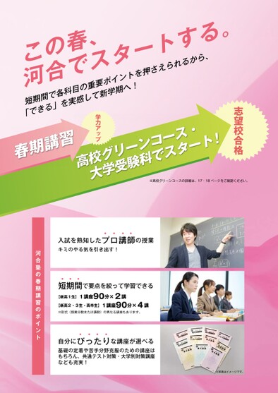 河合でスタートする。この春、短期間で各科目の重要ポイントを押さえられるから、「できる」を実感して新学期へ!高校グリーンコース・春期講習大学受験科でスタート!※高校グリーンコースの詳細は、17・18ページをご確認ください。※写真はイメージです。入試を熟知したプロ講師の授業キミのやる気を引き出す!短期間で要点を絞って学習できる【新高1生】1講座90分×2講【新高2・3生・高卒生】1講座90分×4講※形式(授業分数または講数)の異なる講座もあります。自分にぴったりな講座が選べる基礎の定着や苦手分野克服のための講座はもちろん、共通テスト対策・大学別対策講座なども充実!河合塾の春期講習のポイント