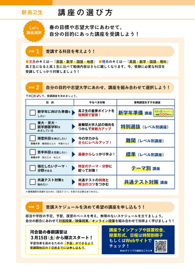 新高2生講座の選び方Letʼs講座選択春の目標や志望大学にあわせて、自分の目的にあった講座を受講しよう!STEP1受講する科目を考えよう!●文系のキミは…「英語・数学・国語・地歴」●理系のキミは…「英語・数学・国語・理科」高2生になると高1生に比べて勉強内容はさらに難しくなります。今、受験に必要な科目を受講してしっかり対策しましょう!STEP2自分の目的や志望大学にあわせ、講座を組み合わせて選択しよう!下のをして、受講講座を決めましょう。目的やるべき対策春期講習おすすめ講座新学年に向けた準備をしたい高2生の重要ポイントを短期間で習得!新学年準備講座1講座円(税込)500東大・京大・医学部医学科をめざしている最難関大学入試の傾向をつかんで実戦力アップ特別選抜(レベル別講座)得意科目を伸ばしたい目標大学:難関国公立大・早慶大など今の学力からさらにレベルアップ!難関(レベル別講座)苦手科目を克服したい目標大学:国公立大・私立大基礎からしっかり学ぶ!標準(レベル別講座)強化したいテーマ・分野がある特定のテーマ・分野に絞って対策!テーマ別講座共通テスト対策を始めたい共通テストの特徴と解法のコツをつかむ共通テスト対策講座※春期講習を受講するために「認定テスト」を受ける必要はありません。STEP3受講スケジュールを決めて希望の講座を申し込もう!部活や学校の予定、予習、復習のペースを考え、無理のないスケジュールを立てましょう。自分の都合にあわせて対面授業/映像授業/オンライン授業を組み合わせて効率よく学びましょう!河合塾の春期講習は3月15日(土)から順次スタート!学習効果を高めるための「予習」ができるよう受講開始日の7日前までには申し込もう。講座ラインアップや設置校舎、授業形式、日程は時間割冊子もしくはWebサイトでチェック!Webサイトでの確認はこちら▶