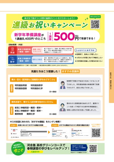 高2生で差がつく分野の重要ポイントをマスターしよう!お申し込みはこちら新高2生講座の選び方新高2準備英語-難関・標準-読解・作文・リスニング高2で差がつく「読解(英文構造と内容の理解)」・「作文(頻出表現の確認)」・「リスニング」の重要ポイントを伝授します!新高2準備数学-難関・標準-図形と方程式文系・理系問わず入試によく出題され、他分野にも波及する内容です。基礎から説明するので、未習の方も安心して受講できます!こんなキミにおすすめ!短期間で、効率よく学習したい4月からの学習に向けて準備をしたい大学受験を意識した学習法を知りたい英語数学※2025年度春期講習90分×2講の一般生受講料*塾生優先申込期間にはお申し込みになれません。先輩たちはこう受講した!おすすめ受講例短期間で実戦力や記述力を身につけることができました。特別選抜国語は映像授業で受講できたので、部活と両立できました。東大・京大・医学部など最難関大学をめざすCさん特別選抜英語特別選抜数学特別選抜国語特別選抜化学計4講座受講講座春休みから受験勉強を始めたので、重要ポイントを絞って学習できる新学年準備講座と、受験に必要な科目を選んで受講しました。新高2準備英語-難関・標準-新高2準備数学-難関・標準-難関物理難関化学計4講座受講講座理系志望で、春から入試対策を始めたいDさん500(税込)円で受講できる!1講座新学年準備講座が1講座8,400円※のところ〈講座種類・内容〉キミの志望にあわせた「おすすめ講座」をカンタン検索!STEP1志望にあわせておすすめ講座を検索STEP2おすすめ講座のなかから希望の講座を選ぶおすすめ講座の検索はこちら志望大東大・京大をめざす医学部医学科をめざす難関国公立大をめざす春期講習で学習を始めた今こそ河合塾高校グリーンコースで春期講習の学びをレベルアップ!入塾受付中Webサイトまたは17・18ページで詳細をチェック!Webサイトでの確認はこちら▶