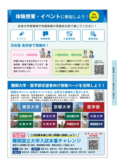 映像授業・オンライン授業の申込・受講方法イベント体験授業入塾説明会個別相談河合塾各校舎で実施中!イベント・体験授業入塾説明会・個別相談学習に役立つさまざまなイベントを各校舎・教室で実施しています。勉強方法やコツを聞いて、ライバルに差をつけましょう。チューター(進学アドバイザー)がカリキュラムやサポート体制について詳しくご説明し、一人ひとりにあったプランを個別にご提案します。お申し込み・検索はこちら▼難関大学・医学部志望者向け情報ページを活用しよう!受験のポイント・必見のイベントなど、お役立ち情報をご紹介します。東京大学、京都大学、医学部医学科、北海道大学、東北大学、名古屋大学、大阪大学、広島大学、九州大学、早稲田大学、慶應義塾大学をめざすキミに向けて、受験対策のポイント・イベント情報・合格した先輩たちの声などをご紹介します。今すぐチェック▶東京大学京都大学医学部北海道大学東北大学名古屋大学大阪大学広島大学九州大学早稲田大学慶應義塾大学体験授業・イベントに参加しよう!申込受付中校舎の学習環境や対面授業の雰囲気を肌で感じてください!対面/自宅受験選択可能!二次試験本番と同じ問題に挑戦しよう!難関国立大学入試本番チャレンジ最新の入試問題に取り組み、解説講義を受講、答案は採点して返却します。2/6(木)13:00受付開始お申し込みはこちら▼教科英語・数学対象学年新高3生、新高2生、中高一貫校に在籍の新高1生対象大学東京大学、京都大学、北海道大学、東北大学、名古屋大学、大阪大学、神戸大学、九州大学
