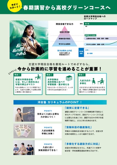 今すぐスタート!春期講習から高校グリーンコースへ志望大学現役合格へのロードマップ現役合格できる力学年高1生4月志望大学対策受験科目の強化学力の土台固め苦手をつくらない主要科目の強化(英語・数学・国語)学力の土台固め(基礎〜応用)学力は積み上げ式入試から逆算した早期対策がカギ!河合塾授業4月〜高1授業なぜな志望大学現役合格を最短ルートでめざすなら、今から計画的に学習を進めることが重要!ら理由①理由②志望大学現役合格には、忙しい高校生活と学習の両立がマスト今から効率よくコツコツ学習することで、入試から逆算して必要な対策に無理なく取り組める!大学受験は高校受験と比べて学習範囲・量が増える今からスタートすることで、しっかり学力の土台を固められる!理由③入試方式の多様化さまざまな入試方式がある大学入試。早期から準備を進めておけば受験のチャンスが増える!河合塾カリキュラムのPOINT!POINT1効率よく入試に必要な力が身につく!「確実に定着できる」講習と高校グリーンコースの相乗効果で効率よく学力アップできます。高校グリーンコースで入試に必要な力を身につけ、講習では日々の学びを短期間で強化し、さらに学力を伸ばせます。POINT2入試全範囲を早期に対策!「受験科目の徹底強化」早期から受験科目を強化することで、志望大学対策の時間をしっかり確保できます。POINT3入試に近い実戦演習ができる!「多様化する選抜方式に対応」志望大学対策はもちろん、共通テスト対策や総合型・学校推薦型選抜対策も万全です。
