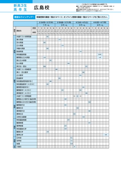 新高3生高卒生●同一名称の講座は設置校舎・設置期間(ターム)・授業時間(時限)が異なっても同一内容です。●担当講師は変更になる場合がありますので、あらかじめご了承ください。●講師のフルネームはWebサイトでご確認ください。この色のマスが授業のある時限です。3/24(月)~3/27(木)3/28(金)~3/31(月)4/2(水)~4/5(土)4/6(日)~4/9(水)4/6日)/(1ターム2ターム3ターム4ターム12345612345612345612345609:30〜11:0011:20〜12:5013:40〜15:1015:30〜17:0017:20〜18:5019:10〜20:4009:30〜11:0011:20〜12:5013:40〜15:1015:30〜17:0017:20〜18:5019:10〜20:4009:30〜11:0011:20〜12:5013:40〜15:1015:30〜17:0017:20〜18:5019:10〜20:4009:30〜11:0011:20〜12:5013:40〜15:1015:30〜17:0017:20〜18:5019:10〜20:40坂口岡本岡本山添堤(智)小谷小谷坂口髙地樋原森本樋原森本堤(英)堤(英)山添山添小谷坂口黒田府木府木鳥本鳥本真崎岡本・岩本・寺田松浦岩本松浦安平松浦莵原安平莵原岡本安平松原大澤松原松原村上大元中土居桂時限時間講座名教科共通テスト対策英語東大英語京大英語広大英語早慶大英語医進英語特別選抜英語難関国公立大英語国公立大英語私大英語英文法・語法共通テスト対策数学東大・京大数学広大数学医進数学特別選抜理系数学ⅢC特別選抜数学ⅠAⅡBC難関理系数学ⅢC難関数学ⅠAⅡBC標準数学ⅠAⅡBC共通テスト対策国語難関国公立大現代文(論述対策)難関国公立大古文(論述対策)難関現代文難関古文標準現代文標準古文古典文法基礎特別選抜物理難関物理標準物理特別選抜化学難関化学標準化学日本史世界史地理小論文英語数学国語理科地歴小論文広島校●2025年度/春期講習/広島/広島校/高3・卒生/パターン14452025_58_6_611_11_20241107181115.csv/1ページ校了時削除