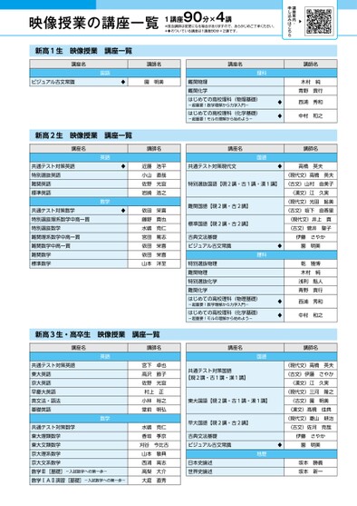 新高1生映像授業講座一覧講座名国語講師名ビジュアル古文常識園明美新高2生映像授業講座一覧講座名英語共通テスト対策英語特別選抜英語難関英語標準英語数学共通テスト対策数学特別選抜理系数学中高一貫特別選抜数学難関理系数学中高一貫難関数学中高一貫難関数学標準数学講師名近藤浩平小山直哉佐野光宜岩崎浩之依田栄喜藤野真也水嶋克仁宮田篤志依田栄喜依田栄喜山本洋至新高3生・高卒生映像授業講座一覧講座名英語共通テスト対策英語東大英語京大英語早慶大英語英文法・語法基礎英語数学共通テスト対策数学東大理類数学東大文類数学京大理系数学京大文系数学数学Ⅲ[基礎]-入試数学への第一歩-数学ⅠAⅡ演習[基礎]-入試数学への第一歩-講師名宮下卓也高沢節子佐野光宜村上正小林裕之堂前明弘水嶋克仁香坂季京刈谷今比古山本敏典西浦高志高梨大介大庭直秀講座名理科難関物理難関化学はじめての高校理科(物理基礎)-超重要!数学理解から力学入門-はじめての高校理科(化学基礎)-超重要!モルの理解から始めよう-講座名国語講師名木村純青野貴行西浦秀和中村和之講師名共通テスト対策現代文高橋英夫特別選抜国語【現2講・古1講・漢1講】難関国語【現2講・古2講】標準国語【現2講・古2講】(現代文)高橋英夫(古文)山村由美子(漢文)江久実(現代文)光田鮎美(古文)坂下由香里(現代文)井上真(古文)菅井聖子古典文法基礎ビジュアル古文常識伊藤さやか園明美理科特別選抜物理難関物理特別選抜化学難関化学はじめての高校理科(物理基礎)-超重要!数学理解から力学入門-はじめての高校理科(化学基礎)-超重要!モルの理解から始めよう-講座名国語共通テスト対策国語【現2講・古1講・漢1講】東大国語【現2講・古1講・漢1講】早大国語【現2講・古2講】乾雅博木村純浅利魁人青野貴行西浦秀和中村和之講師名(現代文)高橋英夫(古文)伊藤さやか(漢文)江久実(現代文)三河隆之(古文)園明美(漢文)髙橋佳典(現代文)菱山耕治(古文)佐河克哉古典文法基礎ビジュアル古文常識伊藤さやか園明美地歴日本史論述世界史論述坂本勝義坂本新一▶講座案内・申し込みはこちら映像授業の講座一覧1講座90分×4講*担当講師は変更になる場合がありますので、あらかじめご了承ください。*♦のついている講座は1講座90分×2講です。