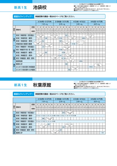新高1生●同一名称の講座は設置校舎・設置期間(ターム)・授業時間(時限)が異なっても同一内容です。●担当講師は変更になる場合がありますので、あらかじめご了承ください。●講師のフルネームはWebサイトでご確認ください。この色のマスが授業のある時限です。新高1生●同一名称の講座は設置校舎・設置期間(ターム)・授業時間(時限)が異なっても同一内容です。●担当講師は変更になる場合がありますので、あらかじめご了承ください。●講師のフルネームはWebサイトでご確認ください。この色のマスが授業のある時限です。池袋校講座名時限時間3/24(月)~3/27(木)3/28(金)~3/31(月)4/2(水)~4/5(土)4/6(日)~4/7(月)1ターム2ターム3ターム4ターム12345612345612345612345609:00〜10:3010:50〜12:2013:20〜14:5015:10〜16:4017:00〜18:3018:50〜20:2009:00〜10:3010:50〜12:2013:20〜14:5015:10〜16:4017:00〜18:3018:50〜20:2009:00〜10:3010:50〜12:2013:20〜14:5015:10〜16:4017:00〜18:3018:50〜20:2009:00〜10:3010:50〜12:2013:20〜14:5015:10〜16:4017:00〜18:3018:50〜20:203/26・27の2日間近藤3/30・31の2日間高山三木3/26・27の2日間福永3/24・25の2日間3/28・29の2日間3/24・25の2日間新高1準備英語-特別選抜-新高1準備英語-難関-新高1準備英語-標準-受験英語の基礎の基礎新高1準備数学-特別選抜-新高1準備数学中高一貫-難関-新高1準備数学-難関-新高1準備数学-標準-新高1準備国語-難関・標準-難関物理難関化学はじめての高校理科(物理基礎)はじめての高校理科(化学基礎)木村(智)松野桜井3/28・29の2日間4/2・3の2日間髙橋(保)3/30・31の2日間木村(智)9:00~11:103/28・29の2日間中村(隆)中村(隆)古川中林・品田3/28・29の2日間3/30・31の2日間岡島3/30・31の2日間岡島中野(喜)4/6の1日完結中野(喜)野()秋葉原館講座名時限時間新高1準備英語-特別選抜-新高1準備英語-難関-新高1準備英語-標準-新高1準備数学-特別選抜-新高1準備数学-難関-新高1準備数学-標準-新高1準備国語-難関・標準-難関化学3/24(月)~3/27(木)3/28(金)~3/31(月)4/2(水)~4/5(土)4/6(日)~4/7(月)1ターム2ターム3ターム4ターム12345612345612345612345609:00〜10:3010:50〜12:2013:20〜14:5015:10〜16:4017:00〜18:3018:50〜20:2009:00〜10:3010:50〜12:2013:20〜14:5015:10〜16:4017:00〜18:3018:50〜20:2009:00〜10:3010:50〜12:2013:20〜14:5015:10〜16:4017:00〜18:3018:50〜20:2009:00〜10:3010:50〜12:2013:20〜14:5015:10〜16:4017:00〜18:3018:50〜20:203/15(土)〜3/16(日)17:00〜18:30岩間3/28(金)〜3/29(土)17:00〜18:30吉川(量)森(博)3/28・29の2日間濱崎3/24・25の2日間3/15(土)〜3/16(日)15:10〜16:40郷田夏川3/24・25の2日間3/30・31の2日間島田上野3/28・29の2日間大澤大澤教科英語数学国語理科教科英語数学国語理科●2025年度/春期講習/東日本/池袋/高1生/パターン14452025_58_3_314_31_20241107180809.csv/1ページ校了時削除
