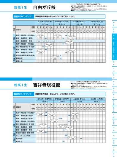 新高1生●同一名称の講座は設置校舎・設置期間(ターム)・授業時間(時限)が異なっても同一内容です。●担当講師は変更になる場合がありますので、あらかじめご了承ください。●講師のフルネームはWebサイトでご確認ください。この色のマスが授業のある時限です。新高1生●同一名称の講座は設置校舎・設置期間(ターム)・授業時間(時限)が異なっても同一内容です。●担当講師は変更になる場合がありますので、あらかじめご了承ください。●講師のフルネームはWebサイトでご確認ください。この色のマスが授業のある時限です。麹町新宿池袋秋葉原自由が丘吉祥寺調布立川町田厚木藤沢横浜あざみ野金沢文庫大宮南浦和川越柏津田沼千葉水戸自由が丘校講座名時限時間新高1準備英語-特別選抜-新高1準備英語-難関-新高1準備英語-標準-新高1準備数学-特別選抜-新高1準備数学中高一貫-難関-新高1準備数学-難関-新高1準備数学-標準-新高1準備国語-難関・標準-難関物理難関化学3/24(月)~3/27(木)3/28(金)~3/31(月)4/2(水)~4/5(土)4/6(日)~4/7(月)1ターム2ターム3ターム4ターム12345612345612345612345609:00〜10:3010:50〜12:2013:20〜14:5015:10〜16:4017:00〜18:3018:50〜20:2009:00〜10:3010:50〜12:2013:20〜14:5015:10〜16:4017:00〜18:3018:50〜20:2009:00〜10:3010:50〜12:2013:20〜14:5015:10〜16:4017:00〜18:3018:50〜20:2009:00〜10:3010:50〜12:2013:20〜14:5015:10〜16:4017:00〜18:3018:50〜20:203/24・25の2日間藤田3/30・31の2日間3/15(土)〜3/16(日)13:20〜14:50水野3/24・25の2日間合田高田3/26・27の2日間瀬﨑3/28・29の2日間3/28・29の2日間明慶國分3/30・31の2日間福島3/28・29の2日間中竹中西尾吉祥寺現役館講座名時限時間新高1準備英語-特別選抜-新高1準備英語-難関-新高1準備英語-標準-新高1準備数学-特別選抜-新高1準備数学中高一貫-難関-新高1準備数学-難関-新高1準備数学-標準-新高1準備国語-難関・標準-ビジュアル古文常識難関物理難関化学3/24(月)~3/27(木)3/28(金)~3/31(月)4/2(水)~4/5(土)4/6(日)~4/7(月)1ターム2ターム3ターム4ターム12345612345612345612345609:00〜10:3010:50〜12:2013:20〜14:5015:10〜16:4017:00〜18:3018:50〜20:2009:00〜10:3010:50〜12:2013:20〜14:5015:10〜16:4017:00〜18:3018:50〜20:2009:00〜10:3010:50〜12:2013:20〜14:5015:10〜16:4017:00〜18:3018:50〜20:2009:00〜10:3010:50〜12:2013:20〜14:5015:10〜16:4017:00〜18:3018:50〜20:203/24・25の2日間山本明慶3/24・25の2日間内山(洋)3/28・29の2日間3/26・27の2日間秋山3/28・29の2日間3/26・27の2日間和田福島早川3/28・29の2日間3/30・31の2日間中島相川流川3/28・29の2日間貴川3/30・31の2日間竹中教科英語数学国語理科教科英語数学国語理科●2025年度/春期講習/東日本/自由が丘/高1生/パターン14452025_58_3_337_31_20241107180809.csv/1ページ校了時削除