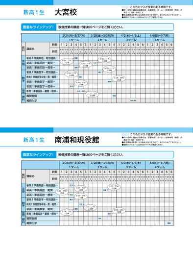新高1生●同一名称の講座は設置校舎・設置期間(ターム)・授業時間(時限)が異なっても同一内容です。●担当講師は変更になる場合がありますので、あらかじめご了承ください。●講師のフルネームはWebサイトでご確認ください。この色のマスが授業のある時限です。新高1生●同一名称の講座は設置校舎・設置期間(ターム)・授業時間(時限)が異なっても同一内容です。●担当講師は変更になる場合がありますので、あらかじめご了承ください。●講師のフルネームはWebサイトでご確認ください。この色のマスが授業のある時限です。大宮校講座名時限時間新高1準備英語-特別選抜-新高1準備英語-難関-新高1準備英語-標準-新高1準備数学-特別選抜-新高1準備数学中高一貫-難関-新高1準備数学-難関-新高1準備数学-標準-新高1準備国語-難関・標準-難関物理難関化学3/24(月)~3/27(木)3/28(金)~3/31(月)4/2(水)~4/5(土)4/6(日)~4/7(月)1ターム2ターム3ターム4ターム12345612345612345612345609:00〜10:3010:50〜12:2013:20〜14:5015:10〜16:4017:00〜18:3018:50〜20:2009:00〜10:3010:50〜12:2013:20〜14:5015:10〜16:4017:00〜18:3018:50〜20:2009:00〜10:3010:50〜12:2013:20〜14:5015:10〜16:4017:00〜18:3018:50〜20:2009:00〜10:3010:50〜12:2013:20〜14:5015:10〜16:4017:00〜18:3018:50〜20:203/26・27の2日間明慶岩間3/26・27の2日間山川3/26・27の2日間國分河本3/26・27の2日間小林・品田3/30・31の2日間3/30・31の2日間口3/28・29の2日間秦野3/24・25の2日間宇都向井(勇)南浦和現役館講座名時限時間3/24(月)~3/27(木)3/28(金)~3/31(月)4/2(水)~4/5(土)4/6(日)~4/7(月)1ターム2ターム3ターム4ターム12345612345612345612345609:00〜10:3010:50〜12:2013:20〜14:5015:10〜16:4017:00〜18:3018:50〜20:2009:00〜10:3010:50〜12:2013:20〜14:5015:10〜16:4017:00〜18:3018:50〜20:2009:00〜10:3010:50〜12:2013:20〜14:5015:10〜16:4017:00〜18:3018:50〜20:2009:00〜10:3010:50〜12:2013:20〜14:5015:10〜16:4017:00〜18:3018:50〜20:20新高1準備英語-特別選抜-新高1準備英語-難関-新高1準備英語-標準-新高1準備数学-特別選抜-新高1準備数学中高一貫-難関-新高1準備数学-難関-新高1準備国語-難関・標準-難関物理難関化学3/24・25の2日間石川秋谷横川3/24・25の2日間3/26・27の2日間3/28・29の2日間加藤今田秦野3/26・27の2日間3/24・25の2日間3/28・29の2日間品田金子國兼國兼教科英語数学国語理科教科英語数学国語理科●2025年度/春期講習/東日本/大宮/高1生/パターン14452025_58_3_324_31_20241107180809.csv/1ページ校了時削除