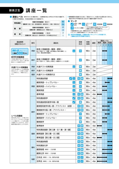 講座名授業形式授業時間講数講座レベル標準12難関34特別選抜56▶春期講習を受講するために「認定テスト」を受ける必要はありません。現在の学力や学習状況にあわせて講座を選択できます。●マーク採点・添削ありリスニングあり対対面授業映映像授業オオンライン授業デジタル端末などを使ってオンライン上で受講できるライブ型の授業です。*映像授業の申し込み・受講方法は59ページをご覧ください。*オンライン授業の詳細は61ページをご覧ください。「新学年準備講座」が進級お祝いキャンペーンの対象です。1講座500円で受講できます。563412特別選抜難関標準受講の目安偏差値65.0〜目標大学:東大・京大・医学部医学科・東京科学大・一橋大・旧帝大など受講の目安偏差値55.0〜目標大学:難関国公立大・早慶大など受講の目安偏差値〜55.0目標大学:国公立大・GMARCH・その他私立大など●講座レベル※受講の目安偏差値は、河合塾全統模試における偏差値です。数字が大きいほど難度が高く、入試難易度の高い大学をめざす方向けの講座です。新高2生講座一覧講座種類(講座のねらい)進級お祝いキャンペーン1講座円(税込)500新学年準備講座河合塾の講座を初めて受ける方におすすめです。90分×2講で重要ポイントを習得できます。共通テスト対策講座大学入学共通テストでの高得点獲得をめざして、この春から共通テスト対策を行い、準備を万全にします。教科英語数学英語数学国語新高2準備英語-難関・標準-高2で差がつく「読解(英文構造と内容の理解)」と「作文(頻出表現の確認)」新高2準備数学-難関・標準-高2で差がつく「図形と方程式」の重要ポイントを伝授!共通テスト対策英語共通テスト対策数学共通テスト対策現代文特別選抜英語難関英語-トップレベル-英語難関英語-ハイレベル-難関英語標準英語特別選抜数学特別選抜理系数学中高一貫対対映映映対映対対映対映対映映対映対映対対映対映対映対映対映対映対映対映対映対オ対オ90分2講90分2講90分90分90分90分90分90分90分90分90分90分90分90分90分90分90分90分90分90分90分90分90分90分90分90分90分2講2講2講4講4講4講4講4講4講4講4講4講4講4講4講4講4講4講4講4講4講4講4講4講4講数学レベル別講座現役合格に向けて、この春に学力をレベルアップさせたい方を対象とした講座です。レベル別に講座が設置されていますので、自分に最適な講座を選ぶことができます。難関理系数学中高一貫-アドバンスト(速習)-難関数学中高一貫-アドバンスト-難関数学-トップレベル-難関数学-ハイレベル-難関数学標準数学特別選抜国語【現2講・古1講・漢1講】国語難関国語【現2講・古2講】標準国語【現2講・古2講】理科特別選抜物理特別選抜化学難関物理(新高1・2生共通)難関化学(新高1・2生共通)地歴日本史(新高2・3生・高卒生共通)世界史(新高2・3生・高卒生共通)