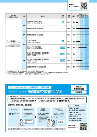 講座案内・申し込みはこちら▶講座レベル標準12難関34特別選抜56講座種類(講座のねらい)教科英語講座名受験英語の基礎の基礎(新高1・2・3生・高卒生共通)短期集中習得TIME英語数学短期集中習得TIME数学テーマ別講座特定のテーマ・分野について学習します。得意分野の更なる強化や苦手分野の克服など、自分の目的に応じて講座を選ぶことができます。国語理科古典文法基礎(新高2・3生・高卒生共通)ビジュアル古文常識(新高1・2・3生・高卒生共通)はじめての高校理科(物理基礎)-超重要!数学理解から力学入門-(新高1・2生共通)はじめての高校理科(化学基礎)-超重要!モルの理解から始めよう-(新高1・2生共通)授業形式対--授業時間講数60分8講90分3講90分3講映90分4講対映90分2講対映90分2講対映90分2講短期集中習得TIME化学基礎-90分2講*「難関理系数学中高一貫」「難関数学中高一貫」は内容が一部重複します。*「はじめての高校理科(物理基礎)」「はじめての高校理科(化学基礎)」は2024年度春期講習の同名講座と同一内容です。*「ビジュアル古文常識」は2024年度春期・夏期・冬期講習の同名講座と同一内容です。一人ひとりのレベルにあった問題演習で、分野を習得!英語・数学・化学基礎短期集中習得TIME習得TIMEとは?新宿校吉祥寺現役館対面演習・講義形式の講座ではなく、一人ひとりの学習状況にあわせた問題演習を通して、分野の習得をめざす講座です。・入試を熟知した学習指導員が徹底サポート。授業中、好きなタイミングで質問できます。習得TIME受講の流れ(例:英語)ガイダンス習得度確認テスト受講の進め方などをお伝えします。単元の習得度を確認し、取り組む問題レベルを確認します。現在の習得状況を確認!問題演習・フィードバック自分のペースで問題演習に取り組みます。指導員が教室内を巡回しているので、わからないところがあればすぐに質問することができます。チェックテスト・フィードバックチェックテストの結果を踏まえたフィードバックとアドバイスを個別に行います。つまずいても気軽に聞ける!扱う分野〈英語:全3講〉英文法/英作文/長文読解〈数学:全3講〉方程式・式と証明/図形と方程式〈化学基礎:全2講〉化学量計算/酸塩基持ち物:解答を記載するノートと、タブレットなどのデジタル端末(お持ちの方のみ)をご持参ください。日程などの詳細・お申し込みはこちら▶