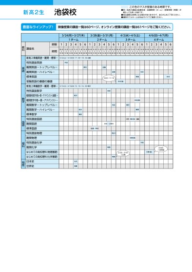 新高2生●同一名称の講座は設置校舎・設置期間(ターム)・授業時間(時限)が異なっても同一内容です。●担当講師は変更になる場合がありますので、あらかじめご了承ください。●講師のフルネームはWebサイトでご確認ください。この色のマスが授業のある時限です。3/24(月)~3/27(木)3/28(金)~3/31(月)4/2(水)~4/5(土)4/6(日)~4/7(月)1ターム2ターム3ターム4ターム12345612345612345612345609:00〜10:3010:50〜12:2013:20〜14:5015:10〜16:4017:00〜18:3018:50〜20:2009:00〜10:3010:50〜12:2013:20〜14:5015:10〜16:4017:00〜18:3018:50〜20:2009:00〜10:3010:50〜12:2013:20〜14:5015:10〜16:4017:00〜18:3018:50〜20:2009:00〜10:3010:50〜12:2013:20〜14:5015:10〜16:4017:00〜18:3018:50〜20:203/22(土)〜3/23(日)17:00〜18:30近藤丹羽東内近藤3/15(土)〜3/16(日)15:10〜16:40柳沢矢作幸長矢作矢作岩間9:00~11:10木村(智)生田相川相川福永大内加藤刈谷柳沢中村(隆)秦野川野・酒井(完)・豊崎松藤・隼坂木村・小野木長谷川中野(喜)今枝岡島3/30・31の2日間岡島4/6の1日完結中野(喜)野()時限時間講座名教科新高2準備英語-難関・標準-特別選抜英語難関英語-トップレベル-難関英語-ハイレベル-標準英語受験英語の基礎の基礎新高2準備数学-難関・標準-特別選抜数学難関理系数学中高一貫-アドバンスト(速習)-難関数学中高一貫-アドバンスト-難関数学-トップレベル-難関数学-ハイレベル-標準数学特別選抜国語難関国語標準国語特別選抜物理難関物理特別選抜化学難関化学はじめての高校理科(物理基礎)はじめての高校理科(化学基礎)日本史世界史英語数学国語理科地歴池袋校●2025年度/春期講習/東日本/池袋/高2生/パターン14452025_58_3_314_32_20241105144454.csv/1ページ校了時削除