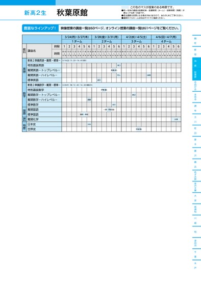 新高2生●同一名称の講座は設置校舎・設置期間(ターム)・授業時間(時限)が異なっても同一内容です。●担当講師は変更になる場合がありますので、あらかじめご了承ください。●講師のフルネームはWebサイトでご確認ください。この色のマスが授業のある時限です。麹町新宿池袋秋葉原自由が丘吉祥寺調布立川町田厚木藤沢横浜あざみ野金沢文庫大宮南浦和川越柏津田沼千葉水戸3/24(月)~3/27(木)3/28(金)~3/31(月)4/2(水)~4/5(土)4/6(日)~4/7(月)1ターム2ターム3ターム4ターム12345612345612345612345609:00〜10:3010:50〜12:2013:20〜14:5015:10〜16:4017:00〜18:3018:50〜20:2009:00〜10:3010:50〜12:2013:20〜14:5015:10〜16:4017:00〜18:3018:50〜20:2009:00〜10:3010:50〜12:2013:20〜14:5015:10〜16:4017:00〜18:3018:50〜20:2009:00〜10:3010:50〜12:2013:20〜14:5015:10〜16:4017:00〜18:3018:50〜20:203/16(日)13:20〜16:40清川髙橋(保)田口村上土岐田3/20(木・祝)13:20〜16:40高梨(大)成川伊東(鋼)古川一瀬・阿部(誠)遠藤篠原・隼坂大内渡辺平尾(雅)大澤大澤講座名時限時間新高2準備英語-難関・標準-特別選抜英語難関英語-トップレベル-難関英語-ハイレベル-標準英語新高2準備数学-難関・標準-特別選抜数学難関数学-トップレベル-難関数学-ハイレベル-標準数学難関国語標準国語難関化学日本史世界史教科英語数学国語理科地歴秋葉原館●2025年度/春期講習/東日本/秋葉原/高2生/パターン14452025_58_3_368_32_20241108163406.csv/1ページ校了時削除