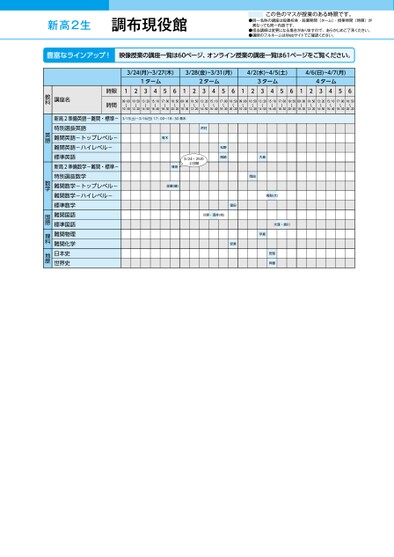 新高2生●同一名称の講座は設置校舎・設置期間(ターム)・授業時間(時限)が異なっても同一内容です。●担当講師は変更になる場合がありますので、あらかじめご了承ください。●講師のフルネームはWebサイトでご確認ください。この色のマスが授業のある時限です。3/24(月)~3/27(木)3/28(金)~3/31(月)4/2(水)~4/5(土)4/6(日)~4/7(月)1ターム2ターム3ターム4ターム12345612345612345612345609:00〜10:3010:50〜12:2013:20〜14:5015:10〜16:4017:00〜18:3018:50〜20:2009:00〜10:3010:50〜12:2013:20〜14:5015:10〜16:4017:00〜18:3018:50〜20:2009:00〜10:3010:50〜12:2013:20〜14:5015:10〜16:4017:00〜18:3018:50〜20:2009:00〜10:3010:50〜12:2013:20〜14:5015:10〜16:4017:00〜18:3018:50〜20:203/15(土)〜3/16(日)17:00〜18:30青木村青木3/24・25の2日間窪田佐藤(健)松野尾崎川野・酒井(完)窪田安東大島岡田高梨(大)大窪・貴川宇都安部斉藤講座名時限時間新高2準備英語-難関・標準-特別選抜英語難関英語-トップレベル-難関英語-ハイレベル-標準英語新高2準備数学-難関・標準-特別選抜数学難関数学-トップレベル-難関数学-ハイレベル-標準数学難関国語標準国語難関物理難関化学日本史世界史教科英語数学国語理科地歴調布現役館●2025年度/春期講習/東日本/調布/高2生/パターン14452025_58_3_367_32_20241105141301.csv/1ページ校了時削除
