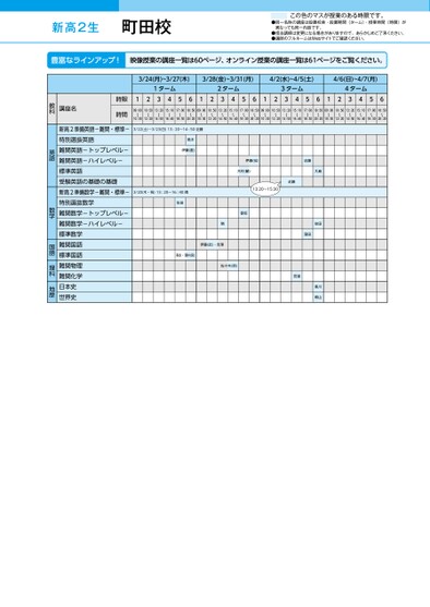 新高2生●同一名称の講座は設置校舎・設置期間(ターム)・授業時間(時限)が異なっても同一内容です。●担当講師は変更になる場合がありますので、あらかじめご了承ください。●講師のフルネームはWebサイトでご確認ください。この色のマスが授業のある時限です。3/24(月)~3/27(木)3/28(金)~3/31(月)4/2(水)~4/5(土)4/6(日)~4/7(月)1ターム2ターム3ターム4ターム12345612345612345612345609:00〜10:3010:50〜12:2013:20〜14:5015:10〜16:4017:00〜18:3018:50〜20:2009:00〜10:3010:50〜12:2013:20〜14:5015:10〜16:4017:00〜18:3018:50〜20:2009:00〜10:3010:50〜12:2013:20〜14:5015:10〜16:4017:00〜18:3018:50〜20:2009:00〜10:3010:50〜12:2013:20〜14:5015:10〜16:4017:00〜18:3018:50〜20:203/22(土)〜3/23(日)13:20〜14:50近藤高木伊藤(直)3/20(木・祝)13:20〜16:40隣生田伊藤(宏)木村(麟)近藤大島近藤13:20~15:30香坂隣伊藤(武)・吉澤森永・酒井(完)佐々木(哲)依田窪田安達黒川桐山時限時間講座名教科新高2準備英語-難関・標準-特別選抜英語難関英語-トップレベル-難関英語-ハイレベル-標準英語受験英語の基礎の基礎新高2準備数学-難関・標準-特別選抜数学難関数学-トップレベル-難関数学-ハイレベル-標準数学難関国語標準国語難関物理難関化学日本史世界史英語数学国語理科地歴町田校●2025年度/春期講習/東日本/町田/高2生/パターン14452025_58_3_325_32_20241108163219.csv/1ページ校了時削除