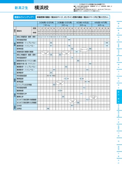 新高2生●同一名称の講座は設置校舎・設置期間(ターム)・授業時間(時限)が異なっても同一内容です。●担当講師は変更になる場合がありますので、あらかじめご了承ください。●講師のフルネームはWebサイトでご確認ください。この色のマスが授業のある時限です。麹町新宿池袋秋葉原自由が丘吉祥寺調布立川町田厚木藤沢横浜あざみ野金沢文庫大宮南浦和川越柏津田沼千葉水戸3/24(月)~3/27(木)3/28(金)~3/31(月)4/2(水)~4/5(土)4/6(日)~4/7(月)1ターム2ターム3ターム4ターム12345612345612345612345609:00〜10:3011:00〜12:3013:20〜14:5015:20〜16:5017:20〜18:5019:20〜20:5009:00〜10:3011:00〜12:3013:20〜14:5015:20〜16:5017:20〜18:5019:20〜20:5009:00〜10:3011:00〜12:3013:20〜14:5015:20〜16:5017:20〜18:5019:20〜20:5009:00〜10:3011:00〜12:3013:20〜14:5015:20〜16:5017:20〜18:5019:20〜20:50青柳青柳仲野仲野3/22(土)15:20〜18:50天倉4/6(日)13:20〜16:50柴田押田香川新野天倉3/24・25の2日間吉崎板谷3/30・31の2日間依田岩村岩村手塚・税田・髙橋(佳)9:00~11:10栗原幸長隣清川瀬谷横田生田小林・大野一瀬・渡部森永・隼坂3/26・27の2日間税田佐々木(哲)浅利杉山小竹4/4・5の2日間杉山4/2・3の2日間黒川岡島斉藤時限時間講座名教科新高2準備英語-難関・標準-特別選抜英語難関英語-トップレベル-難関英語-ハイレベル-標準英語受験英語の基礎の基礎新高2準備数学-難関・標準-特別選抜数学難関理系数学中高一貫-アドバンスト(速習)-難関数学中高一貫-アドバンスト-難関数学-トップレベル-難関数学-ハイレベル-標準数学特別選抜国語難関国語標準国語ビジュアル古文常識特別選抜物理難関物理特別選抜化学難関化学はじめての高校理科(物理基礎)はじめての高校理科(化学基礎)日本史世界史英語数学国語理科地歴横浜校●2025年度/春期講習/東日本/横浜/高2生/パターン14452025_58_3_321_32_20241105141301.csv/1ページ校了時削除