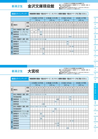 豊富なラインアップ!映像授業の講座一覧は60ページ、オンライン授業の講座一覧は61ページをご覧ください。麹町新宿池袋秋葉原自由が丘吉祥寺調布立川町田厚木藤沢横浜あざみ野金沢文庫大宮南浦和川越柏津田沼千葉水戸3/24(月)~3/27(木)3/28(金)~3/31(月)4/2(水)~4/5(土)4/6(日)~4/7(月)1ターム2ターム3ターム4ターム12345612345612345612345609:00〜10:3010:50〜12:2013:20〜14:5015:10〜16:4017:00〜18:3018:50〜20:2009:00〜10:3010:50〜12:2013:20〜14:5015:10〜16:4017:00〜18:3018:50〜20:2009:00〜10:3010:50〜12:2013:20〜14:5015:10〜16:4017:00〜18:3018:50〜20:2009:00〜10:3010:50〜12:2013:20〜14:5015:10〜16:4017:00〜18:3018:50〜20:20安井3/26・27の2日間安井伊藤(宏)3/22(土)〜3/23(日)17:00〜18:30横田鹿子島・阿部(順)原田村(修)横田堺小池・和田佐々木(哲)講座名時限時間新高2準備英語-難関・標準-難関英語-トップレベル-難関英語-ハイレベル-標準英語新高2準備数学-難関・標準-難関数学-ハイレベル-標準数学難関国語標準国語難関物理難関化学教科英語数学国語理科新高2生大宮校この色のマスが授業のある時限です。●同一名称の講座は設置校舎・設置期間(ターム)・授業時間(時限)が異なっても同一内容です。●担当講師は変更になる場合がありますので、あらかじめご了承ください。●講師のフルネームはWebサイトでご確認ください。豊富なラインアップ!映像授業の講座一覧は60ページ、オンライン授業の講座一覧は61ページをご覧ください。3/24(月)~3/27(木)3/28(金)~3/31(月)4/2(水)~4/5(土)4/6(日)~4/7(月)1ターム2ターム3ターム4ターム12345612345612345612345609:00〜10:3010:50〜12:2013:20〜14:5015:10〜16:4017:00〜18:3018:50〜20:2009:00〜10:3010:50〜12:2013:20〜14:5015:10〜16:4017:00〜18:3018:50〜20:2009:00〜10:3010:50〜12:2013:20〜14:5015:10〜16:4017:00〜18:3018:50〜20:2009:00〜10:3010:50〜12:2013:20〜14:5015:10〜16:4017:00〜18:3018:50〜20:203/22(土)〜3/23(日)09:00〜10:30川原木村(麟)3/15(土)〜3/16(日)17:00〜18:30永島渡辺中村(隆)永島髙橋(慶)松本亀山大澤清水(直)・鹿内宇都久恒川原一瀬・佐河向井(勇)講座名時限時間新高2準備英語-難関・標準-特別選抜英語難関英語-トップレベル-難関英語-ハイレベル-標準英語新高2準備数学-難関・標準-特別選抜数学難関理系数学中高一貫-アドバンスト(速習)-難関数学-トップレベル-難関数学-ハイレベル-標準数学難関国語標準国語難関物理難関化学教科英語数学国語理科●2025年度/春期講習/東日本/金沢文庫/高2生/パターン14452025_58_3_335_32_20241105141301.csv/1ページ校了時削除新高2生金沢文庫現役館この色のマスが授業のある時限です。●同一名称の講座は設置校舎・設置期間(ターム)・授業時間(時限)が異なっても同一内容です。●担当講師は変更になる場合がありますので、あらかじめご了承ください。●講師のフルネームはWebサイトでご確認ください。