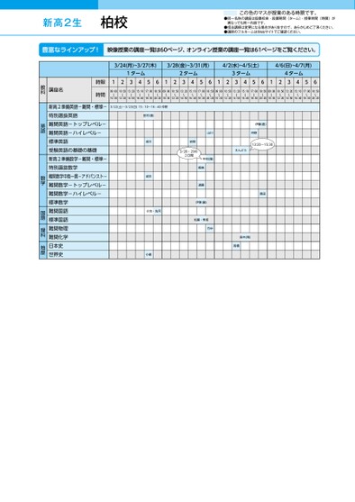 新高2生●同一名称の講座は設置校舎・設置期間(ターム)・授業時間(時限)が異なっても同一内容です。●担当講師は変更になる場合がありますので、あらかじめご了承ください。●講師のフルネームはWebサイトでご確認ください。この色のマスが授業のある時限です。3/24(月)~3/27(木)3/28(金)~3/31(月)4/2(水)~4/5(土)4/6(日)~4/7(月)1ターム2ターム3ターム4ターム12345612345612345612345609:00〜10:3010:50〜12:2013:20〜14:5015:10〜16:4017:00〜18:3018:50〜20:2009:00〜10:3010:50〜12:2013:20〜14:5015:10〜16:4017:00〜18:3018:50〜20:2009:00〜10:3010:50〜12:2013:20〜14:5015:10〜16:4017:00〜18:3018:50〜20:2009:00〜10:3010:50〜12:2013:20〜14:5015:10〜16:4017:00〜18:3018:50〜20:203/22(土)〜3/23(日)15:10〜16:40仲野田村(喜)成川成合小池・佐河小嶋岩間3/28・29の2日間山川中村(隆)飯島遠藤伊東(鋼)松藤・隼坂竹中伊藤(直)仲野13:20~15:30えんどう島田鈴木(翔)髙橋時限時間講座名教科新高2準備英語-難関・標準-特別選抜英語難関英語-トップレベル-難関英語-ハイレベル-標準英語受験英語の基礎の基礎新高2準備数学-難関・標準-特別選抜数学難関数学中高一貫-アドバンスト-難関数学-トップレベル-難関数学-ハイレベル-標準数学難関国語標準国語難関物理難関化学日本史世界史英語数学国語理科地歴柏校●2025年度/春期講習/東日本/柏/高2生/パターン14452025_58_3_322_32_20241105141301.csv/1ページ校了時削除