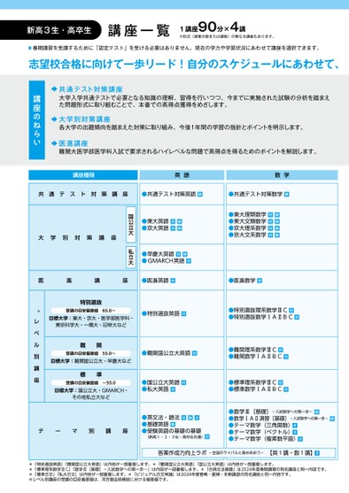 新高3生・高卒生講座一覧1講座90分×4講※形式(授業分数または講数)の異なる講座もあります。▶春期講習を受講するために「認定テスト」を受ける必要はありません。現在の学力や学習状況にあわせて講座を選択できます。志望校合格に向けて一歩リード!自分のスケジュールにあわせて、共通テスト対策講座大学入学共通テストで必要となる知識の理解、習得を行いつつ、今までに実施された試験の分析を踏まえた問題形式に取り組むことで、本番での高得点獲得をめざします。大学別対策講座各大学の出題傾向を踏まえた対策に取り組み、今後1年間の学習の指針とポイントを明示します。医進講座難関大医学部医学科入試で要求されるハイレベルな問題で高得点を得るためのポイントを解説します。講座のねらい講座種類英語数学共通テスト対策講座●共通テスト対策英語映●共通テスト対策数学映●東大理類数学対映●東大文類数学対映●京大理系数学対映●京大文系数学対映●東大英語対映●京大英語対映●早慶大英語対映●GMARCH英語対国公立大私立大大学別対策講座医進講座●医進英語対●医進数学対※レベル別講座特別選抜受講の目安偏差値65.0~目標大学:東大・京大・医学部医学科・東京科学大・一橋大・旧帝大など難関受講の目安偏差値55.0~目標大学:難関国公立大・早慶大など標準受講の目安偏差値~55.0目標大学:国公立大・GMARCH・その他私立大などテーマ別講座●特別選抜英語対●特別選抜理系数学ⅢC対●特別選抜数学ⅠAⅡBC対●難関国公立大英語対●難関理系数学ⅢC対●難関数学ⅠAⅡBC対●国公立大英語対●私大英語対●標準理系数学ⅢC対●標準数学ⅠAⅡBC対●英文法・語法対映オ●基礎英語映●受験英語の基礎の基礎(新高1・2・3生・高卒生共通)対●数学Ⅲ[基礎]-入試数学への第一歩-映●数学ⅠAⅡ演習[基礎]-入試数学への第一歩-映●テーマ数学(三角関数)オ●テーマ数学(ベクトル)オ●テーマ数学(複素数平面)オ答案作成力向上ラボ-全国のライバルと高めあおう-【英1講・数1講】オ*「特別選抜英語」「難関国公立大英語」は内容が一部重複します。*「難関国公立大英語」「国公立大英語」は内容が一部重複します。*「標準理系数学ⅢC」「数学Ⅲ[基礎]-入試数学への第一歩-」は内容が一部重複します。*「古典文法基礎」は2024年度春期講習の同名講座と同一内容です。*「標準古文」「私大古文」は内容が一部重複します。*「ビジュアル古文常識」は2024年度春期・夏期・冬期講習の同名講座と同一内容です。※レベル別講座の受講の目安偏差値は、河合塾全統模試における偏差値です。