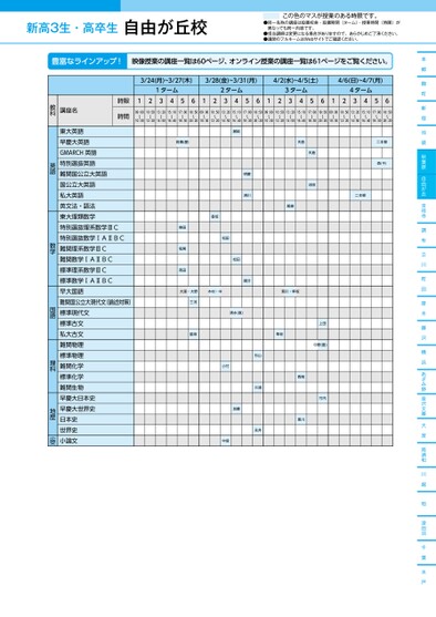 新高3生・高卒生●同一名称の講座は設置校舎・設置期間(ターム)・授業時間(時限)が異なっても同一内容です。●担当講師は変更になる場合がありますので、あらかじめご了承ください。●講師のフルネームはWebサイトでご確認ください。この色のマスが授業のある時限です。本郷麹町新宿池袋秋葉原自由が丘吉祥寺調布立川町田厚木藤沢横浜あざみ野金沢文庫大宮南浦和川越柏津田沼千葉水戸3/24(月)~3/27(木)3/28(金)~3/31(月)4/2(水)~4/5(土)4/6(日)~4/7(月)1ターム2ターム3ターム4ターム12345612345612345612345609:00〜10:3010:50〜12:2013:20〜14:5015:10〜16:4017:00〜18:3018:50〜20:2009:00〜10:3010:50〜12:2013:20〜14:5015:10〜16:4017:00〜18:3018:50〜20:2009:00〜10:3010:50〜12:2013:20〜14:5015:10〜16:4017:00〜18:3018:50〜20:2009:00〜10:3010:50〜12:2013:20〜14:5015:10〜16:4017:00〜18:3018:50〜20:20天倉天倉池田尾崎二本柳二本柳森(千)森(千)二本柳二本柳瀬﨑髙橋(慶)香坂松田明慶清川松田國分横田堀尾高田大窪・大野木村・中菊川・隼坂三河脇坂清水(直)小竹中塚加藤杉山三浦永井隼坂上田中野(喜)竹内西尾黒川時限時間講座名教科東大英語早慶大英語GMARCH英語特別選抜英語難関国公立大英語国公立大英語私大英語英文法・語法東大理類数学特別選抜理系数学ⅢC特別選抜数学ⅠAⅡBC難関理系数学ⅢC難関数学ⅠAⅡBC標準理系数学ⅢC標準数学ⅠAⅡBC早大国語難関国公立大現代文(論述対策)標準現代文標準古文私大古文難関物理標準物理難関化学標準化学難関生物早慶大日本史早慶大世界史日本史世界史小論文英語数学国語理科地歴小論文自由が丘校●2025年度/春期講習/東日本/自由が丘/高3・卒生/パターン14452025_58_3_337_11_20241108163758.csv/1ページ校了時削除