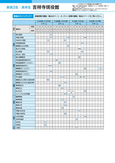 新高3生・高卒生●同一名称の講座は設置校舎・設置期間(ターム)・授業時間(時限)が異なっても同一内容です。●担当講師は変更になる場合がありますので、あらかじめご了承ください。●講師のフルネームはWebサイトでご確認ください。この色のマスが授業のある時限です。3/24(月)~3/27(木)3/28(金)~3/31(月)4/2(水)~4/5(土)4/6(日)~4/7(月)1ターム2ターム3ターム4ターム12345612345612345612345609:00〜10:3010:50〜12:2013:20〜14:5015:10〜16:4017:00〜18:3018:50〜20:2009:00〜10:3010:50〜12:2013:20〜14:5015:10〜16:4017:00〜18:3018:50〜20:2009:00〜10:3010:50〜12:2013:20〜14:5015:10〜16:4017:00〜18:3018:50〜20:2009:00〜10:3010:50〜12:2013:20〜14:5015:10〜16:4017:00〜18:3018:50〜20:20墺矢作小林矢作小林高梨(大)迫田伊藤(武)早川平松二本柳田中(久)久地青柳青木伊藤(剛)内山(洋)香坂長野渡辺香坂秋山秋山窪田木村・貴川軽部・平賀吉澤桑原和田3/30・31の2日間貴川杉山木村三浦早川向井(勇)島崎平賀千葉竹内山内市川時限時間講座名教科東大英語早慶大英語GMARCH英語特別選抜英語難関国公立大英語国公立大英語私大英語英文法・語法東大理類数学特別選抜理系数学ⅢC特別選抜数学ⅠAⅡBC難関理系数学ⅢC難関数学ⅠAⅡBC標準理系数学ⅢC標準数学ⅠAⅡBC早大国語難関国公立大現代文(論述対策)難関国公立大古文(論述対策)標準現代文標準古文私大古文ビジュアル古文常識難関物理標準物理難関化学標準化学標準生物早慶大日本史早慶大世界史日本史論述世界史論述日本史世界史小論文英語数学国語理科地歴小論文吉祥寺現役館●2025年度/春期講習/東日本/吉祥寺/高3・卒生/パターン14452025_58_3_340_11_20241108163758.csv/1ページ校了時削除