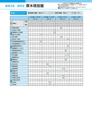 新高3生・高卒生●同一名称の講座は設置校舎・設置期間(ターム)・授業時間(時限)が異なっても同一内容です。●担当講師は変更になる場合がありますので、あらかじめご了承ください。●講師のフルネームはWebサイトでご確認ください。この色のマスが授業のある時限です。3/24(月)~3/27(木)3/28(金)~3/31(月)4/2(水)~4/5(土)4/6(日)~4/7(月)1ターム2ターム3ターム4ターム12345612345612345612345609:00〜10:3010:50〜12:2013:20〜14:5015:10〜16:4017:00〜18:3018:50〜20:2009:00〜10:3010:50〜12:2013:20〜14:5015:10〜16:4017:00〜18:3018:50〜20:2009:00〜10:3010:50〜12:2013:20〜14:5015:10〜16:4017:00〜18:3018:50〜20:2009:00〜10:3010:50〜12:2013:20〜14:5015:10〜16:4017:00〜18:3018:50〜20:20伊藤(宏)二本柳大島大胡川口岡本岩村堀尾森永・山下越野高田高田佐々木(康)早川倉田森脇犬塚中谷佐々木(夫)森永山口絵川渡部矢野安達黒川大野時限時間講座名教科早慶大英語GMARCH英語難関国公立大英語国公立大英語私大英語英文法・語法特別選抜理系数学ⅢC特別選抜数学ⅠAⅡBC難関理系数学ⅢC難関数学ⅠAⅡBC標準理系数学ⅢC標準数学ⅠAⅡBC早大国語難関現代文難関古文標準現代文私大古文難関物理標準物理難関化学標準化学標準生物早慶大日本史早慶大世界史日本史世界史英語数学国語理科地歴厚木現役館●2025年度/春期講習/東日本/厚木/高3・卒生/パターン14452025_58_3_332_11_20241108163758.csv/1ページ校了時削除
