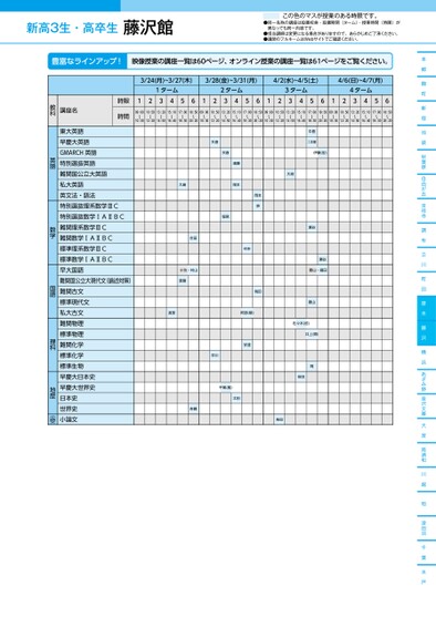 新高3生・高卒生●同一名称の講座は設置校舎・設置期間(ターム)・授業時間(時限)が異なっても同一内容です。●担当講師は変更になる場合がありますので、あらかじめご了承ください。●講師のフルネームはWebサイトでご確認ください。この色のマスが授業のある時限です。本郷麹町新宿池袋秋葉原自由が丘吉祥寺調布立川町田厚木藤沢横浜あざみ野金沢文庫大宮南浦和川越柏津田沼千葉水戸3/24(月)~3/27(木)3/28(金)~3/31(月)4/2(水)~4/5(土)4/6(日)~4/7(月)1ターム2ターム3ターム4ターム12345612345612345612345609:00〜10:3010:50〜12:2013:20〜14:5015:10〜16:4017:00〜18:3018:50〜20:2009:00〜10:3010:50〜12:2013:20〜14:5015:10〜16:4017:00〜18:3018:50〜20:2009:00〜10:3010:50〜12:2013:20〜14:5015:10〜16:4017:00〜18:3018:50〜20:2009:00〜10:3010:50〜12:2013:20〜14:5015:10〜16:4017:00〜18:3018:50〜20:20大胡中島二本柳伊藤(宏)瀬谷瀬谷菱山・福田菱山佐々木(哲)井上(順)岡依田天倉天倉遠藤岡本堀尾岡本堺税田村本大島合田小池・村山斎藤渡部阿部(順)安達早川平尾(雅)太田斉藤柴田時限時間講座名教科東大英語早慶大英語GMARCH英語特別選抜英語難関国公立大英語私大英語英文法・語法特別選抜理系数学ⅢC特別選抜数学ⅠAⅡBC難関理系数学ⅢC難関数学ⅠAⅡBC標準理系数学ⅢC標準数学ⅠAⅡBC早大国語難関国公立大現代文(論述対策)難関古文標準現代文私大古文難関物理標準物理難関化学標準化学標準生物早慶大日本史早慶大世界史日本史世界史小論文英語数学国語理科地歴小論文藤沢館●2025年度/春期講習/東日本/藤沢/高3・卒生/パターン14452025_58_3_331_11_20241108163758.csv/1ページ校了時削除