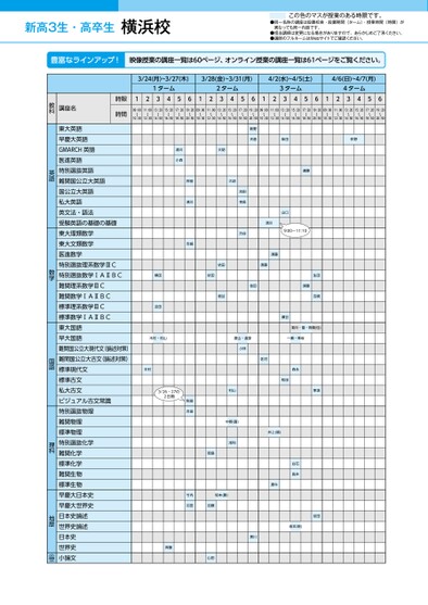 新高3生・高卒生●同一名称の講座は設置校舎・設置期間(ターム)・授業時間(時限)が異なっても同一内容です。●担当講師は変更になる場合がありますので、あらかじめご了承ください。●講師のフルネームはWebサイトでご確認ください。この色のマスが授業のある時限です。3/24(月)~3/27(木)3/28(金)~3/31(月)4/2(水)~4/5(土)4/6(日)~4/7(月)1ターム2ターム3ターム4ターム12345612345612345612345609:00〜10:3011:00〜12:3013:20〜14:5015:20〜16:5017:20〜18:5019:20〜20:5009:00〜10:3011:00〜12:3013:20〜14:5015:20〜16:5017:20〜18:5019:20〜20:5009:00〜10:3011:00〜12:3013:20〜14:5015:20〜16:5017:20〜18:5019:20〜20:5009:00〜10:3011:00〜12:3013:20〜14:5015:20〜16:5017:20〜18:5019:20〜20:50時限時間講座名教科横浜校新野天倉柴田仲野仲野清川小森押田清川吉崎大胡大胡池田幸長渋谷遠藤山口清川9:00~11:10須藤須藤依田依田依田板谷菱山・渡部小林佐河横田迫田木村・村山木村須藤生田吉崎瀬谷菊川・園・髙橋(佳)一瀬・隼坂森永和田隼坂3/26・27の2日間税田合田村山中野(喜)浅利岡島竹内沼田坂本(勝)加藤斉藤山田井上(順)白石長井唐牛依田坂本(新)黒川東大英語早慶大英語GMARCH英語医進英語特別選抜英語難関国公立大英語国公立大英語私大英語英文法・語法受験英語の基礎の基礎東大理類数学東大文類数学医進数学特別選抜理系数学ⅢC特別選抜数学ⅠAⅡBC難関理系数学ⅢC難関数学ⅠAⅡBC標準理系数学ⅢC標準数学ⅠAⅡBC東大国語早大国語難関国公立大現代文(論述対策)難関国公立大古文(論述対策)標準現代文標準古文私大古文ビジュアル古文常識特別選抜物理難関物理標準物理特別選抜化学難関化学標準化学難関生物標準生物早慶大日本史早慶大世界史日本史論述世界史論述日本史世界史小論文英語数学国語理科地歴小論文●2025年度/春期講習/東日本/横浜/高3・卒生/パターン14452025_58_3_321_11_20241108163628.csv/1ページ校了時削除