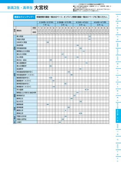 新高3生・高卒生●同一名称の講座は設置校舎・設置期間(ターム)・授業時間(時限)が異なっても同一内容です。●担当講師は変更になる場合がありますので、あらかじめご了承ください。●講師のフルネームはWebサイトでご確認ください。この色のマスが授業のある時限です。本郷麹町新宿池袋秋葉原自由が丘吉祥寺調布立川町田厚木藤沢横浜あざみ野金沢文庫大宮南浦和川越柏津田沼千葉水戸3/24(月)~3/27(木)3/28(金)~3/31(月)4/2(水)~4/5(土)4/6(日)~4/7(月)1ターム2ターム3ターム4ターム12345612345612345612345609:00〜10:3010:50〜12:2013:20〜14:5015:10〜16:4017:00〜18:3018:50〜20:2009:00〜10:3010:50〜12:2013:20〜14:5015:10〜16:4017:00〜18:3018:50〜20:2009:00〜10:3010:50〜12:2013:20〜14:5015:10〜16:4017:00〜18:3018:50〜20:2009:00〜10:3010:50〜12:2013:20〜14:5015:10〜16:4017:00〜18:3018:50〜20:20仲野渡部仲野飯田中村(隆)國分永島久恒早川佐藤金城久地山川松本幸長渋谷口大澤秦野口一瀬・佐河鈴木鈴木脇坂今西向井(勇)宇都金依田小嶋松崎時限時間講座名教科東大英語早慶大英語GMARCH英語医進英語特別選抜英語難関国公立大英語国公立大英語私大英語英文法・語法東大理類数学東大文類数学医進数学特別選抜理系数学ⅢC特別選抜数学ⅠAⅡBC難関理系数学ⅢC難関数学ⅠAⅡBC標準理系数学ⅢC標準数学ⅠAⅡBC早大国語難関国公立大現代文(論述対策)標準現代文標準古文私大古文難関物理標準物理難関化学標準化学早慶大日本史早慶大世界史小論文英語数学国語理科地歴小論文大宮校●2025年度/春期講習/東日本/大宮/高3・卒生/パターン14452025_58_3_324_11_20241108163628.csv/1ページ校了時削除