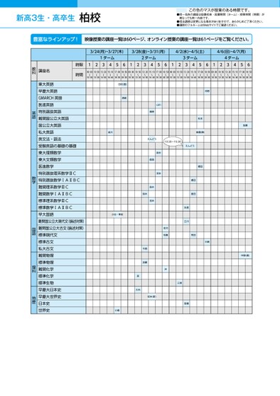 新高3生・高卒生●同一名称の講座は設置校舎・設置期間(ターム)・授業時間(時限)が異なっても同一内容です。●担当講師は変更になる場合がありますので、あらかじめご了承ください。●講師のフルネームはWebサイトでご確認ください。この色のマスが授業のある時限です。3/24(月)~3/27(木)3/28(金)~3/31(月)4/2(水)~4/5(土)4/6(日)~4/7(月)1ターム2ターム3ターム4ターム12345612345612345612345609:00〜10:3010:50〜12:2013:20〜14:5015:10〜16:4017:00〜18:3018:50〜20:2009:00〜10:3010:50〜12:2013:20〜14:5015:10〜16:4017:00〜18:3018:50〜20:2009:00〜10:3010:50〜12:2013:20〜14:5015:10〜16:4017:00〜18:3018:50〜20:2009:00〜10:3010:50〜12:2013:20〜14:5015:10〜16:4017:00〜18:3018:50〜20:20田村(喜)濱崎成川仲野松本高橋(勝)山川篠原えんどう13:20~15:30えんどう飯島鈴木宮本鈴木鈴木宮本佐河松藤沖今西加藤原大内坂本(新)郷田郷田島田永島立川荒田川崎三浦髙橋小池・隼坂小嶋加藤加藤中野(喜)中野喜)時限時間講座名教科東大英語早慶大英語GMARCH英語医進英語特別選抜英語難関国公立大英語国公立大英語私大英語英文法・語法受験英語の基礎の基礎東大理類数学東大文類数学医進数学特別選抜理系数学ⅢC特別選抜数学ⅠAⅡBC難関理系数学ⅢC難関数学ⅠAⅡBC標準理系数学ⅢC標準数学ⅠAⅡBC早大国語難関国公立大現代文(論述対策)難関国公立大古文(論述対策)標準現代文標準古文私大古文難関物理標準物理難関化学標準化学標準生物早慶大日本史早慶大世界史日本史世界史英語数学国語理科地歴柏校●2025年度/春期講習/東日本/柏/高3・卒生/パターン14452025_58_3_322_11_20241108163628.csv/1ページ校了時削除
