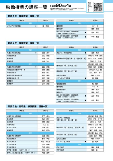 新高1生映像授業講座一覧講座名国語講師名ビジュアル古文常識園明美新高2生映像授業講座一覧講座名英語共通テスト対策英語特別選抜英語難関英語標準英語数学共通テスト対策数学特別選抜理系数学中高一貫特別選抜数学難関理系数学中高一貫難関数学中高一貫難関数学標準数学講師名近藤浩平小山直哉佐野光宜岩崎浩之依田栄喜藤野真也水嶋克仁宮田篤志依田栄喜依田栄喜山本洋至新高3生・高卒生映像授業講座一覧講座名英語共通テスト対策英語東大英語京大英語早慶大英語英文法・語法基礎英語数学共通テスト対策数学東大理類数学東大文類数学京大理系数学京大文系数学数学Ⅲ[基礎]-入試数学への第一歩-数学ⅠAⅡ演習[基礎]-入試数学への第一歩-講師名宮下卓也高沢節子佐野光宜村上正小林裕之堂前明弘水嶋克仁香坂季京刈谷今比古山本敏典西浦高志高梨大介大庭直秀講座名理科難関物理難関化学はじめての高校理科(物理基礎)-超重要!数学理解から力学入門-はじめての高校理科(化学基礎)-超重要!モルの理解から始めよう-講座名国語講師名木村純青野貴行西浦秀和中村和之講師名共通テスト対策現代文高橋英夫特別選抜国語【現2講・古1講・漢1講】難関国語【現2講・古2講】標準国語【現2講・古2講】(現代文)高橋英夫(古文)山村由美子(漢文)江久実(現代文)光田鮎美(古文)坂下由香里(現代文)井上真(古文)菅井聖子古典文法基礎ビジュアル古文常識伊藤さやか園明美理科特別選抜物理難関物理特別選抜化学難関化学はじめての高校理科(物理基礎)-超重要!数学理解から力学入門-はじめての高校理科(化学基礎)-超重要!モルの理解から始めよう-講座名国語共通テスト対策国語【現2講・古1講・漢1講】東大国語【現2講・古1講・漢1講】早大国語【現2講・古2講】乾雅博木村純浅利魁人青野貴行西浦秀和中村和之講師名(現代文)高橋英夫(古文)伊藤さやか(漢文)江久実(現代文)三河隆之(古文)園明美(漢文)髙橋佳典(現代文)菱山耕治(古文)佐河克哉古典文法基礎ビジュアル古文常識伊藤さやか園明美地歴日本史論述世界史論述坂本勝義坂本新一▶講座案内・申し込みはこちら1講座90分×4講*担当講師は変更になる場合がありますので、あらかじめご了承ください。*♦のついている講座は1講座90分×2講です。映像授業の講座一覧