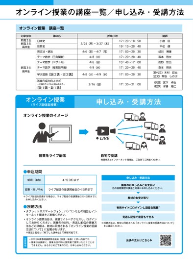 オンライン授業の講座一覧/申し込み・受講方法オンライン授業講座一覧対象学年新高2生新高3生高卒生新高3生高卒生講座名日本史世界史英文法・語法テーマ数学(三角関数)テーマ数学(ベクトル)テーマ数学(複素数平面)授業日時3/24(月)~3/27(木)4/6(日)・4/7(月)4/8(火)4/6(日)4/9(水)17:20~18:5019:10~20:4017:00~20:3017:20~20:4013:40~17:0017:20~20:40早大国語【現2講・古2講】4/8(火)・4/9(水)17:00~20:303/16(日)17:30~21:00講師小倉匡平松健成川博康森本啓夫佐野哲也森本啓夫(現代文)木村哲也(古文)隼坂しのぶ(英語)宮下卓也(数学)水嶋克仁答案作成力向上ラボ-全国のライバルと高めあおう-【英1講・数1講】オンライン授業(ライブ配信型授業)オンライン授業のイメージ申し込み・受講方法ILVE授業をライブ配信自宅で受講視聴端末とインターネット環境は、ご自身でご用意ください。●申込期間新規・追加4/9(水)まで変更・取りやめライブ配信の受講開始日の4日前まで申し込み・受講方法講座のお申し込みとお支払い他の春期講習の講座と同様にお申し込みください。※ライブ配信を受講する場合は、ライブ配信の受講開始日の4日前までにお申し込みください。教材のお受け取り専用サイトにログインし講義を視聴※見逃し配信で復習もできる※視聴方法は、教材に同封される「オンライン授業の受講方法について」をご確認ください。受講の流れはこちら▼●視聴方法タブレットやスマートフォン、パソコンなどの機器とインターネット環境をご準備ください。オンライン授業当日は、視聴サイトへアクセスし、ログインしてお待ちください。視聴先のURL・見逃し配信の視聴方法などの詳細は、教材に同封される「オンライン授業の受講方法について」に記載があります。※見逃し配信は「終了した講単位」で視聴可能です。2025年度春期講習同名講座(対面/映像)と同一内容です。授業担当講師に、授業当日やWeb質問書で質問いただくことはできません。あらかじめご了承のうえ、お申し込みください。注意事項