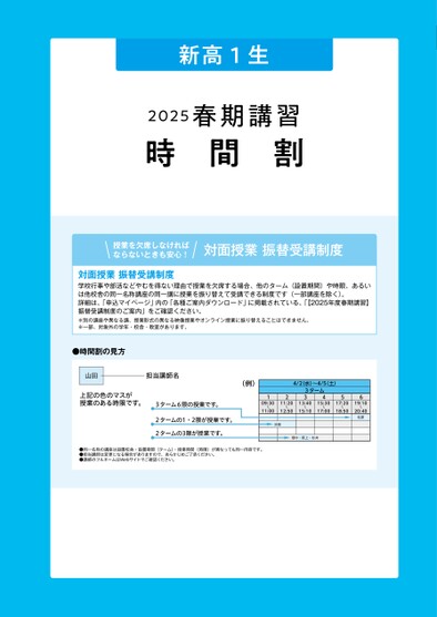 新高1生2025春期講習時間割授業を欠席しなければならないときも安心!対面授業振替受講制度対面授業振替受講制度学校行事や部活などやむを得ない理由で授業を欠席する場合、他のターム(設置期間)や時限、あるいは他校舎の同一名称講座の同一講に授業を振り替えて受講できる制度です(一部講座を除く)。詳細は、「申込マイページ」内の「各種ご案内ダウンロード」に掲載されている、「【2025年度春期講習】振替受講制度のご案内」をご確認ください。※別の講座や異なる講、授業形式の異なる映像授業やオンライン授業に振り替えることはできません。※一部、対象外の学年・校舎・教室があります。●時間割の見方山田担当講師名上記の色のマスが授業のある時限です。3ターム6限の授業です。2タームの1・2限が授業です。2タームの3限が授業です。(例)109:3011:00211:2012:50池田4/2水)〜4/5(土)3ターム3413:4015:1015:3017:00517:2018:50619:1020:40松原畑中・阪上・杉井●同一名称の講座は設置校舎・設置期間(ターム)・授業時間(時限)が異なっても同一内容です。●担当講師は変更になる場合がありますので、あらかじめご了承ください。●講師のフルネームはWebサイトでご確認ください。