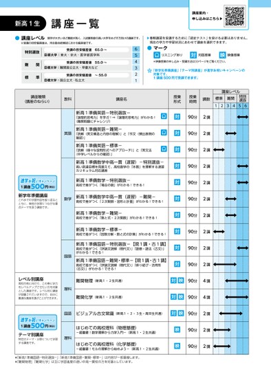 ▶春期講習を受講するために「認定テスト」を受ける必要はありません。現在の学力や学習状況にあわせて講座を選択できます。●マークリスニングあり対対面授業映映像授業*映像授業の申し込み・受講方法は33ページをご覧ください。「新学年準備講座」「テーマ別講座」が進学お祝いキャンペーンの対象です。1講座500円で受講できます。563412特別選抜難関標準受講の目安偏差値65.0〜目標大学:東大・京大・医学部医学科受講の目安偏差値55.0〜目標大学:難関国公立大・早慶大など受講の目安偏差値〜55.0目標大学:国公立大・私立大●講座レベル※受講の目安偏差値は、河合塾全統模試における偏差値です。数字が大きいほど難度が高く、入試難易度の高い大学をめざす方向けの講座です。新高1生講座一覧講座案内・申し込みはこちら▶講座種類(講座のねらい)教科講座名授業形式授業時間講数講座レベル標準12難関34特別選抜56英語新高1準備英語-特別選抜-「論理的思考力」を学ぶ!⇒「論理的思考力」がわかる!(難関問題にチャレンジ)新高1準備英語-難関-「読解(英文構造と内容の理解)」と「作文(頻出表現の確認)」新高1準備英語-標準-「読解(様々な設問形式へのアプローチ)」と「英文法(中学レベルからの確認)」新高1準備数学中高一貫(速習)-特別選抜-高い到達目標を見据えて、高校数学の「本質」を理解する速習カリキュラム対応講座新高1準備数学-特別選抜-高校で差がつく「場合の数」がわかる!できる!数学新高1準備数学中高一貫(速習)-難関-高校で差がつく「2次関数・図形と計量」がわかる!できる!進学お祝いキャンペーン1講座円(税込)500新学年準備講座これまでの学習内容を振り返るとともに、高校の学習につながる重点テーマを扱う講座です。新高1準備数学-難関-高校で差がつく「数と式・2次関数」がわかる!できる!新高1準備数学-標準-高校で差がつく「因数分解・数と式の計算」がわかる!できる!新高1準備国語-特別選抜-【現1講・古1講】高校で差がつく「評論文読解(現代文)」「語意・語法(古文)」がわかる!できる!新高1準備国語-難関・標準-【現1講・古1講】高校で差がつく「評論文読解(現代文)」「係り結び・活用形(古文)」がわかる!できる!対対対対対対対対対対90分2講90分2講90分2講90分2講90分2講90分2講90分2講90分2講90分2講90分2講国語理科レベル別講座現役合格に向けて、この春に学力をレベルアップさせたい方を対象とした講座です。レベル別に講座が設置されていますので、自分に最適な講座を選ぶことができます。難関物理(新高1・2生共通)難関化学(新高1・2生共通)対映90分4講対映90分4講進学お祝いキャンペーン1講座円(税込)500テーマ別講座特定のテーマ・分野について学習する講座です。国語ビジュアル古文常識(新高1・2・3生・高卒生共通)対映90分2講理科はじめての高校理科(物理基礎)-超重要!数学理解から力学入門-(新高1・2生共通)はじめての高校理科(化学基礎)-超重要!モルの理解から始めよう-(新高1・2生共通)映映90分2講90分2講*「新高1準備国語-特別選抜-」「新高1準備国語-難関・標準-」は内容が一部重複します。*「難関物理」「難関化学」は主に学習進度の速い中高一貫校の方を対象としています。