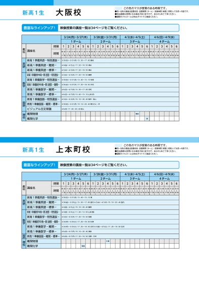 新高1生●同一名称の講座は設置校舎・設置期間(ターム)・授業時間(時限)が異なっても同一内容です。●担当講師は変更になる場合がありますので、あらかじめご了承ください。●講師のフルネームはWebサイトでご確認ください。この色のマスが授業のある時限です。新高1生●同一名称の講座は設置校舎・設置期間(ターム)・授業時間(時限)が異なっても同一内容です。●担当講師は変更になる場合がありますので、あらかじめご了承ください。●講師のフルネームはWebサイトでご確認ください。この色のマスが授業のある時限です。講座名時限時間新高1準備英語-特別選抜-新高1準備英語-難関-新高1準備英語-標準-新高1準備数学中高一貫(速習)-特別選抜-新高1準備数学-特別選抜-新高1準備数学中高一貫(速習)-難関-新高1準備数学-難関-新高1準備数学-標準-新高1準備国語-特別選抜-新高1準備国語-難関・標準-ビジュアル古文常識難関物理難関化学3/24(月)~3/27(木)3/28(金)~3/31(月)4/2(水)~4/5(土)4/6(日)~4/9(水)1ターム2ターム3ターム4ターム12345612345612345612345609:30〜11:0011:20〜12:5013:40〜15:1015:30〜17:0017:20〜18:5019:10〜20:4009:30〜11:0011:20〜12:5013:40〜15:1015:30〜17:0017:20〜18:5019:10〜20:4009:30〜11:0011:20〜12:5013:40〜15:1015:30〜17:0017:20〜18:5019:10〜20:4009:30〜11:0011:20〜12:5013:40〜15:1015:30〜17:0017:20〜18:5019:10〜20:403/30(日)〜3/31(月)15:30〜17:00国松4/4(金)〜4/5(土)17:20〜18:50清水4/2(水)〜4/3(木)17:20〜18:50清水4/2(水)〜4/3(木)17:20〜18:50藤野3/30(日)〜3/31(月)13:40〜15:10寺尾3/26(水)〜3/27(木)17:20〜18:50木村4/6(日)〜4/7(月)15:30〜17:00河村4/6(日)〜4/7(月)13:40〜15:10山本(洋)4/2(水)〜4/3(木)19:10〜20:40畑中・阪上3/30(日)〜3/31(月)19:10〜20:40野口(た)・仲4/6(日)17:20〜20:40阪上植田西上本町校講座名時限時間新高1準備英語-特別選抜-新高1準備英語-難関-新高1準備英語-標準-新高1準備数学中高一貫(速習)-特別選抜-新高1準備数学-特別選抜-新高1準備数学中高一貫(速習)-難関-新高1準備数学-難関-新高1準備数学-標準-新高1準備国語-難関・標準-難関物理難関化学3/24(月)~3/27(木)3/28(金)~3/31(月)4/2(水)~4/5(土)4/6(日)~4/9(水)1ターム2ターム3ターム4ターム12345612345612345612345609:30〜11:0011:20〜12:5013:40〜15:1015:30〜17:0017:20〜18:5019:10〜20:4009:30〜11:0011:20〜12:5013:40〜15:1015:30〜17:0017:20〜18:5019:10〜20:4009:30〜11:0011:20〜12:5013:40〜15:1015:30〜17:0017:20〜18:5019:10〜20:4009:30〜11:0011:20〜12:5013:40〜15:1015:30〜17:0017:20〜18:5019:10〜20:403/30(日)〜3/31(月)13:40〜15:10慎3/28(金)〜3/29(土)15:30〜17:00西内4/2(水)〜4/3(木)19:10〜20:40西内4/4(金)〜4/5(土)19:10〜20:40藤森4/4(金)〜4/5(土)11:20〜12:50山本(敏)4/2(水)〜4/3(木)17:20〜18:50宮崎3/24(月)〜3/25(火)17:20〜18:50杉原3/24(月)〜3/25(火)17:20〜18:50北村4/4(金)〜4/5(土)17:20〜18:50北村4/6(日)〜4/7(月)19:10〜20:40湘田4/6(日)〜4/7(月)17:20〜18:50北野・大村大學宮路教科英語数学国語理科教科英語数学国語理科大阪校●2025年度/春期講習/近畿/大阪/高1生/パターン14452025_58_5_511_31_20241107181019.csv/1ページ校了時削除