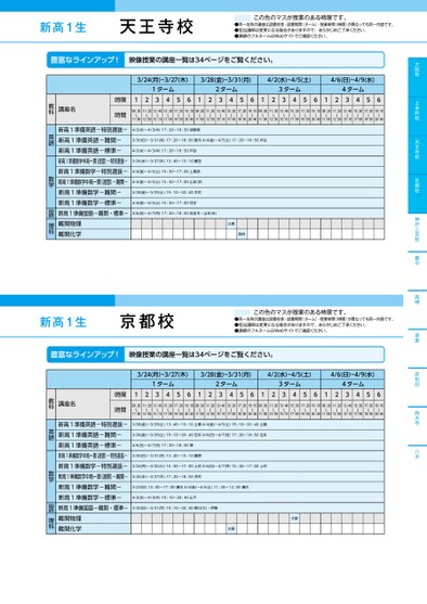 新高1生●同一名称の講座は設置校舎・設置期間(ターム)・授業時間(時限)が異なっても同一内容です。●担当講師は変更になる場合がありますので、あらかじめご了承ください。●講師のフルネームはWebサイトでご確認ください。この色のマスが授業のある時限です。新高1生●同一名称の講座は設置校舎・設置期間(ターム)・授業時間(時限)が異なっても同一内容です。●担当講師は変更になる場合がありますので、あらかじめご了承ください。●講師のフルネームはWebサイトでご確認ください。この色のマスが授業のある時限です。天王寺校講座名時限時間新高1準備英語-特別選抜-新高1準備英語-難関-新高1準備英語-標準-新高1準備数学中高一貫(速習)-特別選抜-新高1準備数学-特別選抜-新高1準備数学中高一貫(速習)-難関-新高1準備数学-難関-新高1準備数学-標準-新高1準備国語-難関・標準-難関物理難関化学3/24(月)~3/27(木)3/28(金)~3/31(月)4/2(水)~4/5(土)4/6(日)~4/9(水)1ターム2ターム3ターム4ターム12345612345612345612345609:30〜11:0011:20〜12:5013:40〜15:1015:30〜17:0017:20〜18:5019:10〜20:4009:30〜11:0011:20〜12:5013:40〜15:1015:30〜17:0017:20〜18:5019:10〜20:4009:30〜11:0011:20〜12:5013:40〜15:1015:30〜17:0017:20〜18:5019:10〜20:4009:30〜11:0011:20〜12:5013:40〜15:1015:30〜17:0017:20〜18:5019:10〜20:404/2(水)〜4/3(木)17:20〜18:50胡摩﨑3/30(日)〜3/31(月)17:20〜18:50西内4/4(金)〜4/5(土)17:20〜18:50戸谷4/2(水)〜4/3(木)17:20〜18:50戸谷3/26(水)〜3/27(木)13:40〜15:10藤田4/4(金)〜4/5(土)15:30〜17:00上高原4/4(金)〜4/5(土)15:30〜17:00山本(洋)3/28(金)〜3/29(土)19:10〜20:40木村4/4(金)〜4/5(土)15:30〜17:00住吉4/6(日)〜4/7(月)17:20〜18:50佐佐木・山本(ま)辻居岡内京都校講座名時限時間新高1準備英語-特別選抜-新高1準備英語-難関-新高1準備英語-標準-新高1準備数学中高一貫(速習)-特別選抜-新高1準備数学-特別選抜-新高1準備数学中高一貫(速習)-難関-新高1準備数学-難関-新高1準備数学-標準-新高1準備国語-難関・標準-難関物理難関化学3/24(月)~3/27(木)3/28(金)~3/31(月)4/2(水)~4/5(土)4/6(日)~4/9(水)1ターム2ターム3ターム4ターム12345612345612345612345609:30〜11:0011:20〜12:5013:40〜15:1015:30〜17:0017:20〜18:5019:10〜20:4009:30〜11:0011:20〜12:5013:40〜15:1015:30〜17:0017:20〜18:5019:10〜20:4009:30〜11:0011:20〜12:5013:40〜15:1015:30〜17:0017:20〜18:5019:10〜20:4009:30〜11:0011:20〜12:5013:40〜15:1015:30〜17:0017:20〜18:5019:10〜20:403/28(金)〜3/29(土)13:40〜15:10土橋4/4(金)〜4/5(土)19:10〜20:40土橋3/28(金)〜3/29(土)19:10〜20:40白井4/6(日)〜4/7(月)17:20〜18:50白井4/6(日)〜4/7(月)17:20〜18:50巽3/30(日)〜3/31(月)13:40〜15:10藤野3/24(月)〜3/25(火)15:30〜17:00上村4/6(日)〜4/7(月)15:30〜17:00上村3/26(水)〜3/27(木)17:20〜18:50河村3/23(日)13:40〜17:00瀬古4/4(金)〜4/5(土)11:20〜12:50瀬古4/2(水)〜4/3(木)19:10〜20:40山下3/30(日)〜3/31(月)19:10〜20:40野口(た)・伊賀大野大學教科英語数学国語理科教科英語数学国語理科●2025年度/春期講習/近畿/天王寺/高1生/パターン14452025_58_5_515_31_20241107181019.csv/1ページ校了時削除