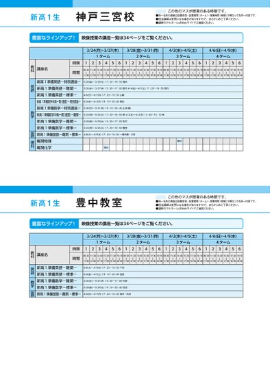 新高1生●同一名称の講座は設置校舎・設置期間(ターム)・授業時間(時限)が異なっても同一内容です。●担当講師は変更になる場合がありますので、あらかじめご了承ください。●講師のフルネームはWebサイトでご確認ください。この色のマスが授業のある時限です。新高1生●同一名称の講座は設置校舎・設置期間(ターム)・授業時間(時限)が異なっても同一内容です。●担当講師は変更になる場合がありますので、あらかじめご了承ください。●講師のフルネームはWebサイトでご確認ください。この色のマスが授業のある時限です。神戸三宮校講座名時限時間新高1準備英語-特別選抜-新高1準備英語-難関-新高1準備英語-標準-新高1準備数学中高一貫(速習)-特別選抜-新高1準備数学-特別選抜-新高1準備数学中高一貫(速習)-難関-新高1準備数学-難関-新高1準備数学-標準-新高1準備国語-難関・標準-難関物理難関化学3/24(月)~3/27(木)3/28(金)~3/31(月)4/2(水)~4/5(土)4/6(日)~4/9(水)1ターム2ターム3ターム4ターム12345612345612345612345609:30〜11:0011:20〜12:5013:40〜15:1015:30〜17:0017:20〜18:5019:10〜20:4009:30〜11:0011:20〜12:5013:40〜15:1015:30〜17:0017:20〜18:5019:10〜20:4009:30〜11:0011:20〜12:5013:40〜15:1015:30〜17:0017:20〜18:5019:10〜20:4009:30〜11:0011:20〜12:5013:40〜15:1015:30〜17:0017:20〜18:5019:10〜20:403/28(金)〜3/29(土)17:20〜18:50清水3/26(水)〜3/27(木)15:30〜17:00西内4/4(金)〜4/5(土)17:20〜18:50西内4/6(日)〜4/7(月)17:20〜18:50山崎4/2(水)〜4/3(木)19:10〜20:40駒井3/30(日)〜3/31(月)19:10〜20:40山本(敏)3/24(月)〜3/25(火)17:20〜18:50岸4/2(水)〜4/3(木)13:40〜15:10岸3/28(金)〜3/29(土)15:30〜17:00松井3/24(月)〜3/25(火)17:20〜18:50権田4/8(火)〜4/9(水)17:20〜18:50一番合戦・大村岡内野村豊中教室講座名時限時間3/24(月)~3/27(木)3/28(金)~3/31(月)4/2(水)~4/5(土)4/6(日)~4/9(水)1ターム2ターム3ターム4ターム12345612345612345612345609:30〜11:0011:20〜12:5013:40〜15:1015:30〜17:0017:20〜18:5019:10〜20:4009:30〜11:0011:20〜12:5013:40〜15:1015:30〜17:0017:20〜18:5019:10〜20:4009:30〜11:0011:20〜12:5013:40〜15:1015:30〜17:0017:20〜18:5019:10〜20:4009:30〜11:0011:20〜12:5013:40〜15:1015:30〜17:0017:20〜18:5019:10〜20:40新高1準備英語-難関-新高1準備英語-標準-新高1準備数学-難関-新高1準備数学-標準-新高1準備国語-難関・標準-4/8(火)〜4/9(水)17:20〜18:50下村4/4(金)〜4/5(土)19:10〜20:40西田3/26(水)〜3/27(木)15:30〜17:00杉原3/28(金)〜3/29(土)19:10〜20:40吉田4/6(日)〜4/7(月)17:20〜18:50畑中・松村教科英語数学国語理科教科英語数学国語●2025年度/春期講習/近畿/神戸三宮/高1生/パターン14452025_58_5_514_31_20241107181019.csv/1ページ校了時削除