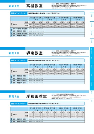 新高1生●同一名称の講座は設置校舎・設置期間(ターム)・授業時間(時限)が異なっても同一内容です。●担当講師は変更になる場合がありますので、あらかじめご了承ください。●講師のフルネームはWebサイトでご確認ください。この色のマスが授業のある時限です。新高1生●同一名称の講座は設置校舎・設置期間(ターム)・授業時間(時限)が異なっても同一内容です。●担当講師は変更になる場合がありますので、あらかじめご了承ください。●講師のフルネームはWebサイトでご確認ください。この色のマスが授業のある時限です。大阪校上本町校天王寺校京都校神戸三宮校豊中高槻堺東岸和田西大寺八木3/24(月)~3/27(木)3/28(金)~3/31(月)4/2(水)~4/5(土)4/6(日)~4/9(水)1ターム2ターム3ターム4ターム12345612345612345612345609:30〜11:0011:20〜12:5013:40〜15:1015:30〜17:0017:20〜18:5019:10〜20:4009:30〜11:0011:20〜12:5013:40〜15:1015:30〜17:0017:20〜18:5019:10〜20:4009:30〜11:0011:20〜12:5013:40〜15:1015:30〜17:0017:20〜18:5019:10〜20:4009:30〜11:0011:20〜12:5013:40〜15:1015:30〜17:0017:20〜18:5019:10〜20:40時限時間講座名教科高槻教室4/4(金)〜4/5(土)17:20〜18:50松井3/30(日)〜3/31(月)15:30〜17:00西田3/30(日)〜3/31(月)17:20〜18:50山下4/2(水)〜4/3(木)17:20〜18:50吉田この色のマスが授業のある時限です。●同一名称の講座は設置校舎・設置期間(ターム)・授業時間(時限)が異なっても同一内容です。●担当講師は変更になる場合がありますので、あらかじめご了承ください。●講師のフルネームはWebサイトでご確認ください。新高1生新高1準備英語-特別選抜-新高1準備英語-難関-新高1準備数学-特別選抜-新高1準備数学-難関-英語数学新高1生堺東教室この色のマスが授業のある時限です。●同一名称の講座は設置校舎・設置期間(ターム)・授業時間(時限)が異なっても同一内容です。●担当講師は変更になる場合がありますので、あらかじめご了承ください。●講師のフルネームはWebサイトでご確認ください。豊富なラインアップ!映像授業の講座一覧は34ページをご覧ください。講座名時限時間3/24(月)~3/27(木)3/28(金)~3/31(月)4/2(水)~4/5(土)4/6(日)~4/9(水)1ターム2ターム3ターム4ターム1234561234561235612345609:30〜11:0011:20〜12:5013:40〜15:1015:30〜17:0017:20〜18:5019:10〜20:4009:30〜11:0011:20〜12:5013:40〜15:1015:30〜17:0017:20〜18:5019:10〜20:4009:30〜11:0011:20〜12:5013:40〜15:1015:30〜17:0017:20〜18:5019:10〜20:4009:30〜11:0011:20〜12:5013:40〜15:1015:30〜17:0017:20〜18:5019:10〜20:40新高1準備英語-難関-新高1準備英語-標準-新高1準備数学-難関-新高1準備数学-標準-4/4(金)〜4/5(土)17:20〜18:50山内4/4(金)〜4/5(土)15:30〜17:00西田4/6(日)〜4/7(月)19:10〜20:40池田4/2(水)〜4/3(木)17:20〜18:50髙戸教科英語数学新高1生岸和田教室この色のマスが授業のある時限です。●同一名称の講座は設置校舎・設置期間(ターム)・授業時間(時限)が異なっても同一内容です。●担当講師は変更になる場合がありますので、あらかじめご了承ください。●講師のフルネームはWebサイトでご確認ください。講座名時限時間3/24(月)~3/27(木)3/28(金)~3/31(月)4/2(水)~4/5(土)4/6(日)~4/9(水)1ターム2ターム3ターム4ターム12345612345612345612345609:30〜11:0011:20〜12:5013:40〜15:1015:30〜17:0017:20〜18:5019:10〜20:4009:30〜11:0011:20〜12:5013:40〜15:1015:30〜17:0017:20〜18:5019:10〜20:4009:30〜11:0011:20〜12:5013:40〜15:1015:30〜17:0017:20〜18:5019:10〜20:4009:30〜11:0011:20〜12:5013:40〜15:1015:30〜17:0017:20〜18:5019:10〜20:40新高1準備英語-難関-新高1準備数学-難関-4/6(日)〜4/7(月)19:10〜20:40藤森4/4(金)〜4/5(土)19:10〜20:40中川教科英語数学豊富なラインアップ!映像授業の講座一覧は34ページをご覧ください。●2025年度/春期講習/近畿/高槻教室/高1生/パターン14452025_58_5_540_31_20241107181019.csv/1ページ校了時削除