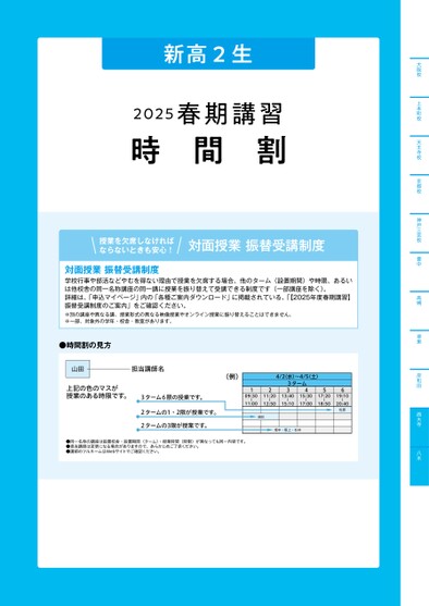 大阪校上本町校天王寺校京都校神戸三宮校豊中高槻堺東岸和田西大寺八木新高2生2025春期講習時間割授業を欠席しなければならないときも安心!対面授業振替受講制度対面授業振替受講制度学校行事や部活などやむを得ない理由で授業を欠席する場合、他のターム(設置期間)や時限、あるいは他校舎の同一名称講座の同一講に授業を振り替えて受講できる制度です(一部講座を除く)。詳細は、「申込マイページ」内の「各種ご案内ダウンロード」に掲載されている、「【2025年度春期講習】振替受講制度のご案内」をご確認ください。※別の講座や異なる講、授業形式の異なる映像授業やオンライン授業に振り替えることはできません。※一部、対象外の学年・校舎・教室があります。●時間割の見方山田担当講師名上記の色のマスが授業のある時限です。3ターム6限の授業です。2タームの1・2限が授業です。2タームの3限が授業です。(例)109:3011:00211:2012:50池田4/2(水)〜4/5(土)3ターム3413:4015:1015:3017:00517:2018:50619:1020:40松原畑中・阪上・杉井●同一名称の講座は設置校舎・設置期間(ターム)・授業時間(時限)が異なっても同一内容です。●担当講師は変更になる場合がありますので、あらかじめご了承ください。●講師のフルネームはWebサイトでご確認ください。