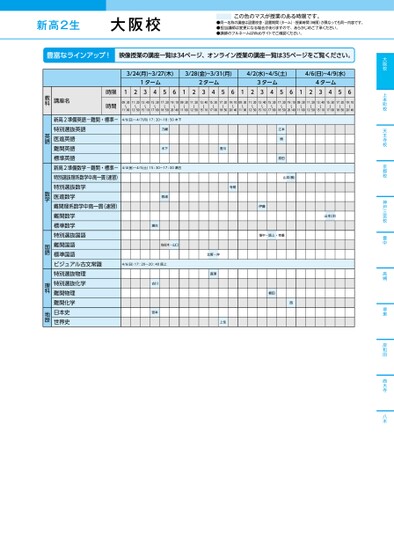 新高2生大阪校この色のマスが授業のある時限です。●同一名称の講座は設置校舎・設置期間(ターム)・授業時間(時限)が異なっても同一内容です。●担当講師は変更になる場合がありますので、あらかじめご了承ください。●講師のフルネームはWebサイトでご確認ください。3/24(月)~3/27(木)3/28(金)~3/31(月)4/2(水)~4/5(土)4/6(日)~4/9(水)1ターム2ターム3ターム4ターム12345612345612345612345609:30〜11:0011:20〜12:5013:40〜15:1015:30〜17:0017:20〜18:5019:10〜20:4009:30〜11:0011:20〜12:5013:40〜15:1015:30〜17:0017:20〜18:5019:10〜20:4009:30〜11:0011:20〜12:5013:40〜15:1015:30〜17:0017:20〜18:5019:10〜20:4009:30〜11:0011:20〜12:5013:40〜15:1015:30〜17:0017:20〜18:5019:10〜20:404/6(日)〜4/7(月)17:20〜18:50木下刀木下4/4(金)〜4/5(土)15:30〜17:00瀬古西浦瀬古佐佐木・山口4/6(日)17:20〜20:40阪上古川宮本江本慎原田山本(敏)伊藤畑中・阪上・幸重山本(洋)植田西香川寺尾北野・仲瀧澤上住講座名時限時間新高2準備英語-難関・標準-特別選抜英語医進英語難関英語標準英語新高2準備数学-難関・標準-特別選抜理系数学中高一貫(速習)特別選抜数学医進数学難関理系数学中高一貫(速習)難関数学標準数学特別選抜国語難関国語標準国語ビジュアル古文常識特別選抜物理特別選抜化学難関物理難関化学日本史世界史教科英語数学国語理科地歴●2025年度/春期講習/近畿/大阪/高2生/パターン14452025_58_5_511_32_20241107181019.csv/1ページ校了時削除