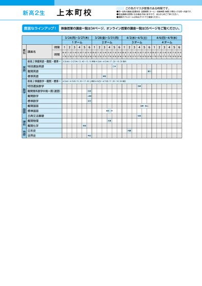 新高2生●同一名称の講座は設置校舎・設置期間(ターム)・授業時間(時限)が異なっても同一内容です。●担当講師は変更になる場合がありますので、あらかじめご了承ください。●講師のフルネームはWebサイトでご確認ください。この色のマスが授業のある時限です。3/24(月)~3/27(木)3/28(金)~3/31(月)4/2(水)~4/5(土)4/6(日)~4/9(水)1ターム2ターム3ターム4ターム12345612345612345612345609:30〜11:0011:20〜12:5013:40〜15:1015:30〜17:0017:20〜18:5019:10〜20:4009:30〜11:0011:20〜12:5013:40〜15:1015:30〜17:0017:20〜18:5019:10〜20:4009:30〜11:0011:20〜12:5013:40〜15:1015:30〜17:0017:20〜18:5019:10〜20:4009:30〜11:0011:20〜12:5013:40〜15:1015:30〜17:0017:20〜18:5019:10〜20:403/26(水)〜3/27(木)13:40〜15:10津留4/2(水)〜4/3(木)17:20〜18:50西内江本津留4/2(水)〜4/3(木)15:30〜17:00上高原4/6(日)〜4/7(月)17:20〜18:50湘田杉原上高原北村宮路寺田青木・仲大學内藤香川宮崎北野・阪上松尾講座名時限時間新高2準備英語-難関・標準-特別選抜英語難関英語標準英語新高2準備数学-難関・標準-特別選抜数学難関理系数学中高一貫(速習)難関数学標準数学難関国語標準国語古典文法基礎難関物理難関化学日本史世界史教科英語数学国語理科地歴上本町校●2025年度/春期講習/近畿/上本町/高2生/パターン14452025_58_5_513_32_20241107181019.csv/1ページ校了時削除