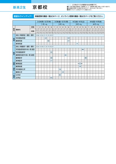 新高2生●同一名称の講座は設置校舎・設置期間(ターム)・授業時間(時限)が異なっても同一内容です。●担当講師は変更になる場合がありますので、あらかじめご了承ください。●講師のフルネームはWebサイトでご確認ください。この色のマスが授業のある時限です。3/24(月)~3/27(木)3/28(金)~3/31(月)4/2(水)~4/5(土)4/6(日)~4/9(水)1ターム2ターム3ターム4ターム12345612345612345612345609:30〜11:0011:20〜12:5013:40〜15:1015:30〜17:0017:20〜18:5019:10〜20:4009:30〜11:0011:20〜12:5013:40〜15:1015:30〜17:0017:20〜18:5019:10〜20:4009:30〜11:0011:20〜12:5013:40〜15:1015:30〜17:0017:20〜18:5019:10〜20:4009:30〜11:0011:20〜12:5013:40〜15:1015:30〜17:0017:20〜18:5019:10〜20:404/4(金)〜4/5(土)19:10〜20:40木下土橋増田4/2(水)〜4/3(木)17:20〜18:50山下佐野木下巽藤田藤田中崎・塚野大學河村宮崎山下前田瀬古小松高木大野講座名時限時間新高2準備英語-難関・標準-特別選抜英語難関英語標準英語新高2準備数学-難関・標準-特別選抜理系数学中高一貫(速習)特別選抜数学難関理系数学中高一貫(速習)難関数学標準数学難関国語難関物理特別選抜化学難関化学日本史世界史教科英語数学国語理科地歴京都校●2025年度/春期講習/近畿/京都/高2生/パターン14452025_58_5_531_32_20241107181019.csv/1ページ校了時削除