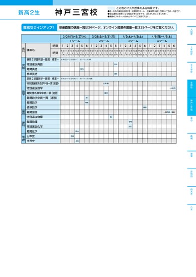 新高2生●同一名称の講座は設置校舎・設置期間(ターム)・授業時間(時限)が異なっても同一内容です。●担当講師は変更になる場合がありますので、あらかじめご了承ください。●講師のフルネームはWebサイトでご確認ください。この色のマスが授業のある時限です。大阪校上本町校天王寺校京都校神戸三宮校豊中高槻堺東岸和田西大寺八木3/24(月)~3/27(木)3/28(金)~3/31(月)4/2(水)~4/5(土)4/6(日)~4/9(水)1ターム2ターム3ターム4ターム12345612345612345612345609:30〜11:0011:20〜12:5013:40〜15:1015:30〜17:0017:20〜18:5019:10〜20:4009:30〜11:0011:20〜12:5013:40〜15:1015:30〜17:0017:20〜18:5019:10〜20:4009:30〜11:0011:20〜12:5013:40〜15:1015:30〜17:0017:20〜18:5019:10〜20:4009:30〜11:0011:20〜12:5013:40〜15:1015:30〜17:0017:20〜18:5019:10〜20:40中村清水山本(敏)藤田乾3/30(日)〜3/31(月)17:20〜18:50慎西内3/26(水)〜3/27(木)17:20〜18:50寺尾岸寺尾寺島岡内上住山本(洋)湘田一番合戦・瀬島野村古川講座名時限時間新高2準備英語-難関・標準-特別選抜英語難関英語標準英語新高2準備数学-難関・標準-特別選抜理系数学中高一貫(速習)特別選抜数学難関理系数学中高一貫(速習)難関数学中高一貫(速習)難関数学標準数学難関国語特別選抜物理難関物理特別選抜化学難関化学日本史世界史教科英語数学国語理科地歴神戸三宮校●2025年度/春期講習/近畿/神戸三宮/高2生/パターン14452025_58_5_514_32_20241107181019.csv/1ページ校了時削除